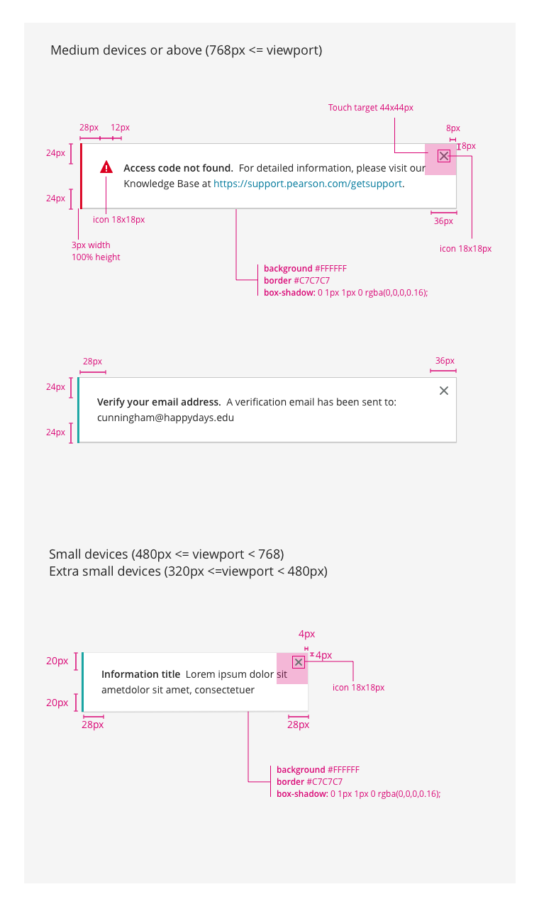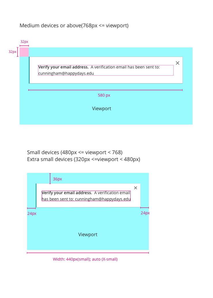 When a message is displayed upon page load the alert will appear anchored in the upper left corner of the viewport or if on a mobile device the message will appear across the top of the viewport. (It will stay in place as the user scrolls the page.) Text in the upper left corner of desktop devices (rather than center) will help ensure screen magnification users do not miss the message upon page load.