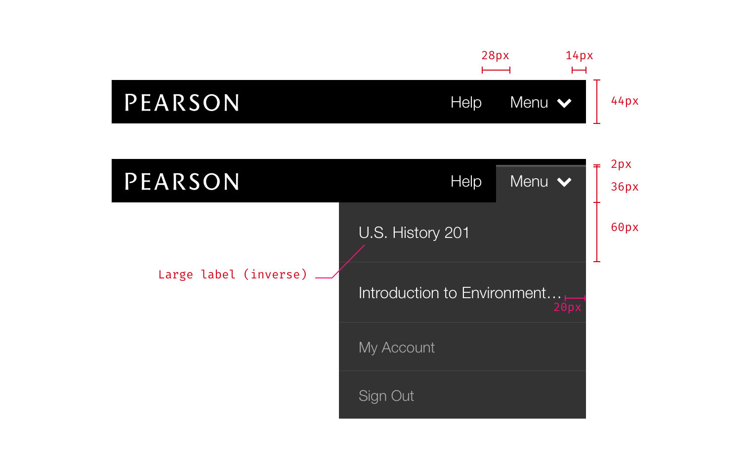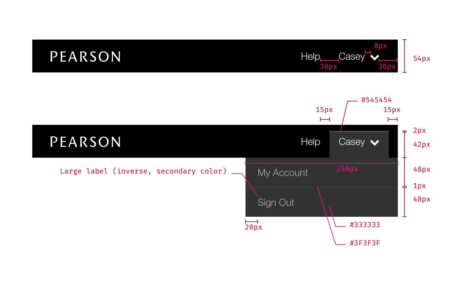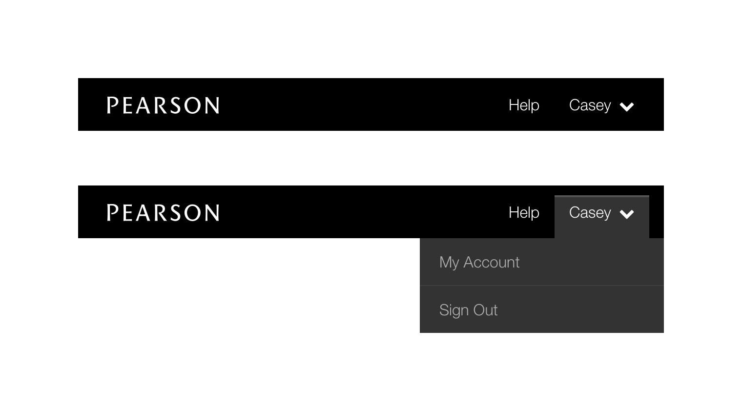 Represents the default signed in experience. Expands on the Signed Out Mode by making the Pearson Logo a home link (currently www.console.pearson.com) and including the User Menu.