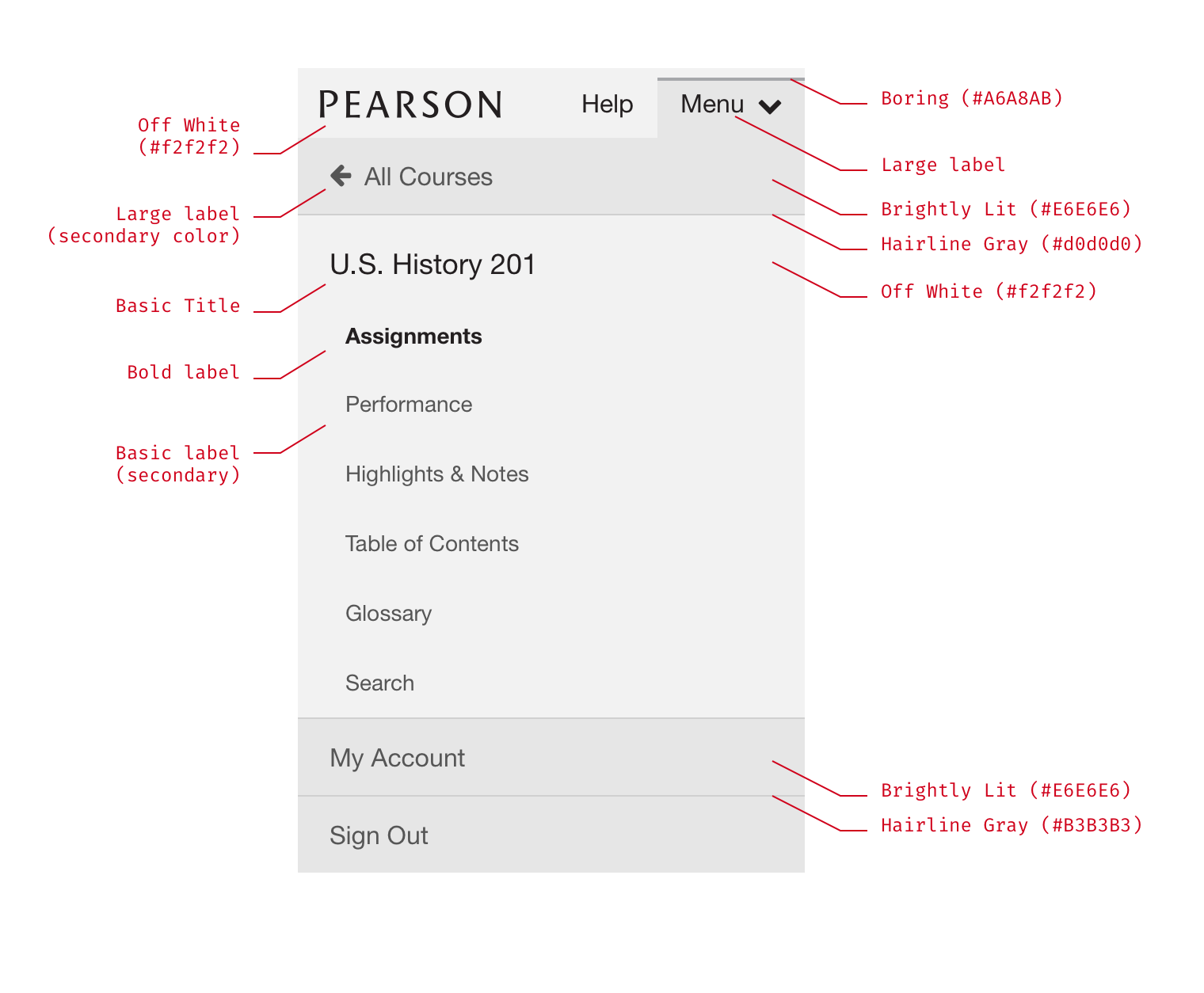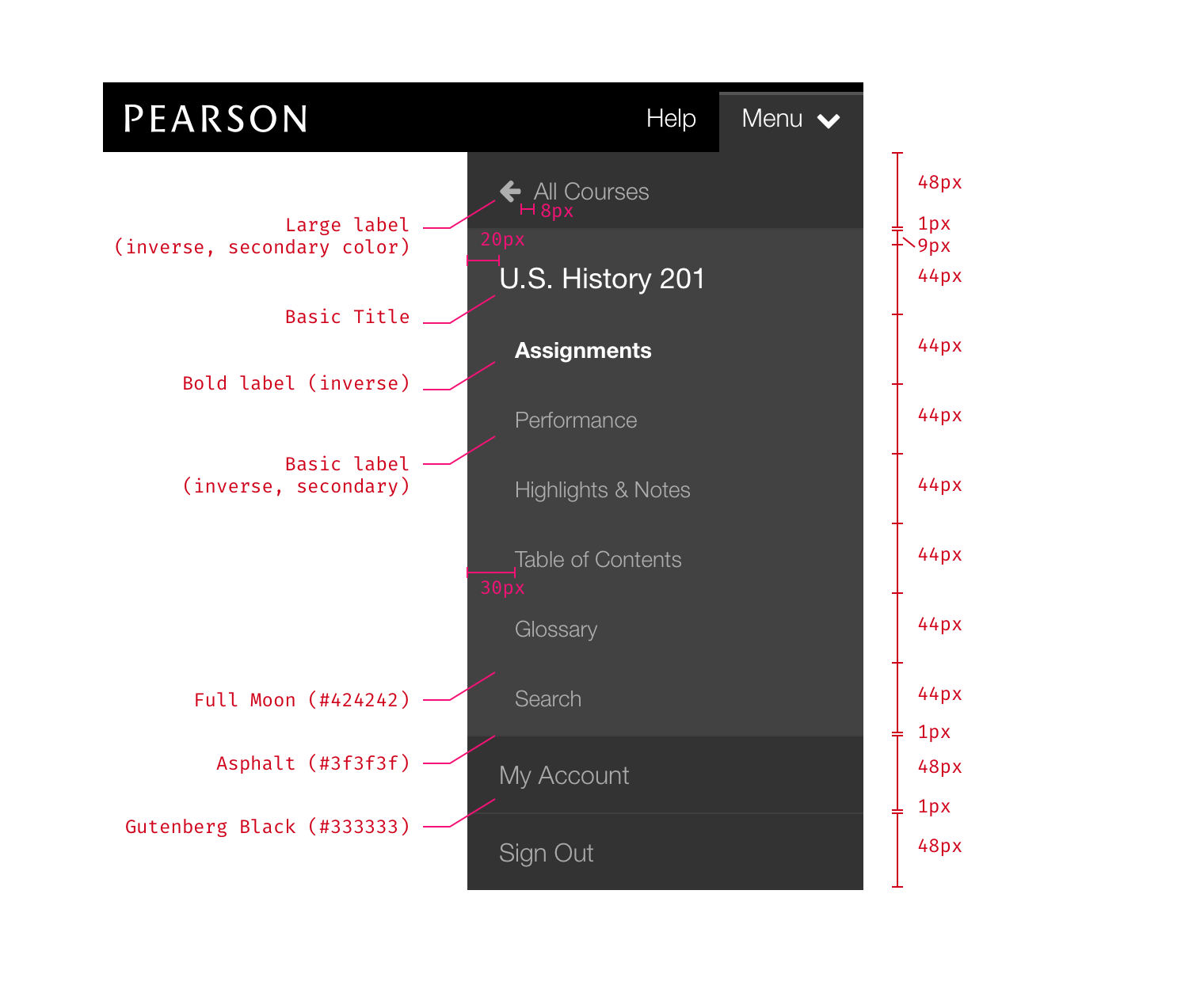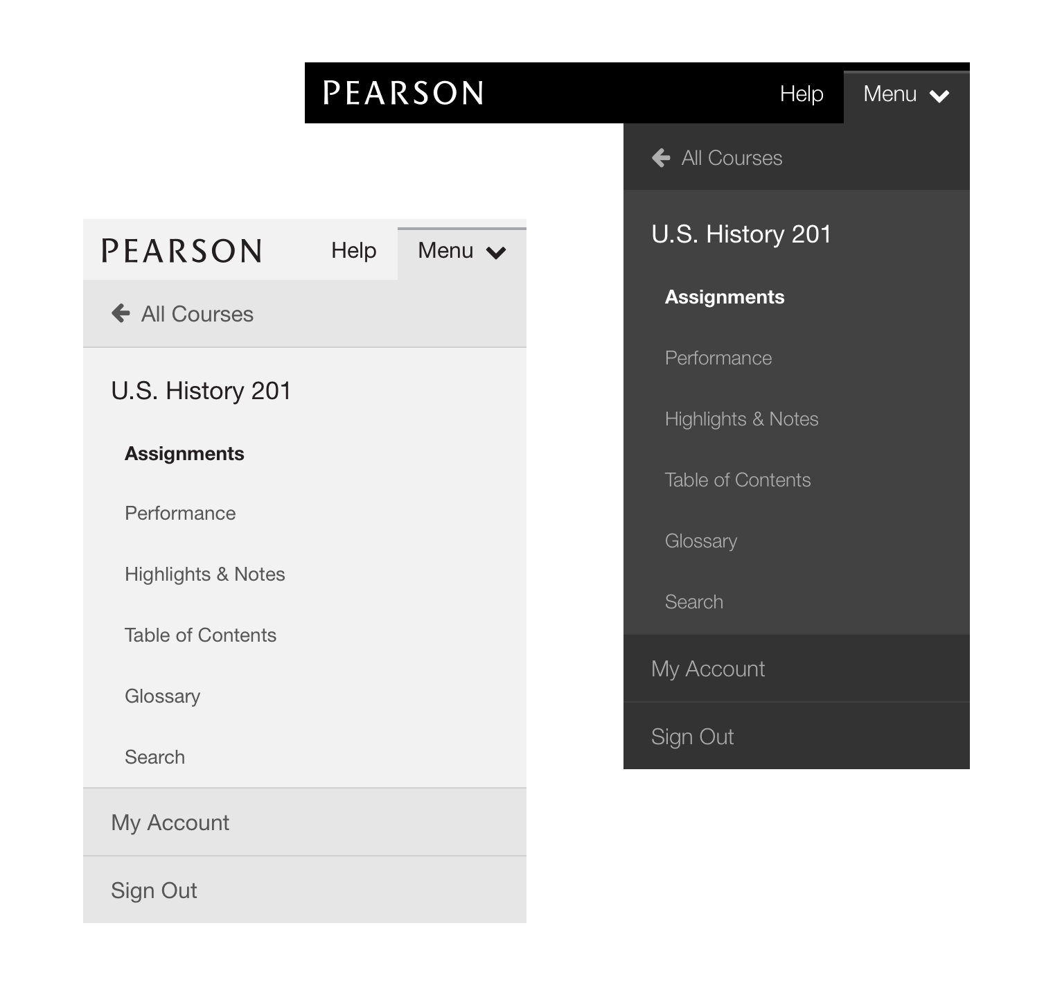 The header can switch it’s color from black to a light gray. This option should be used when the user is viewing a reading, assessment, or some other type of content which requires their complete focus.