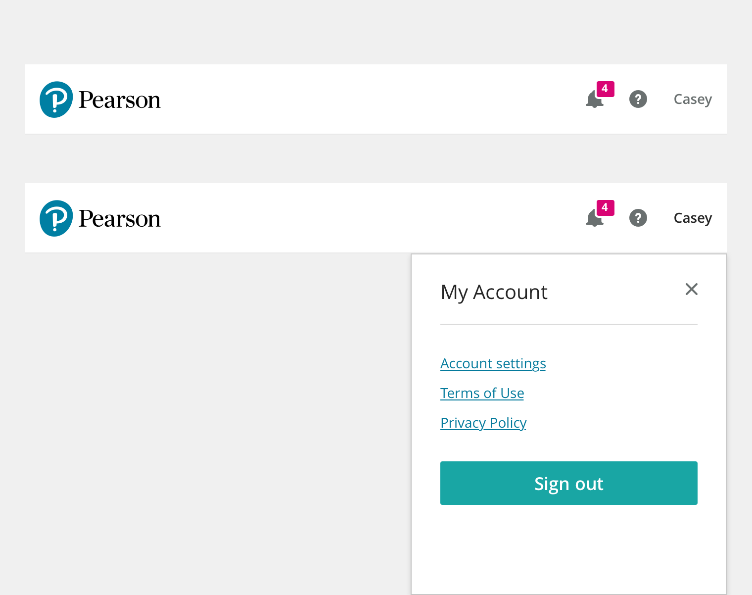 Represents the default signed in experience. Expands on the Signed Out Mode by making the Pearson Logo a home link (currently www.console.pearson.com) and including the User Menu.