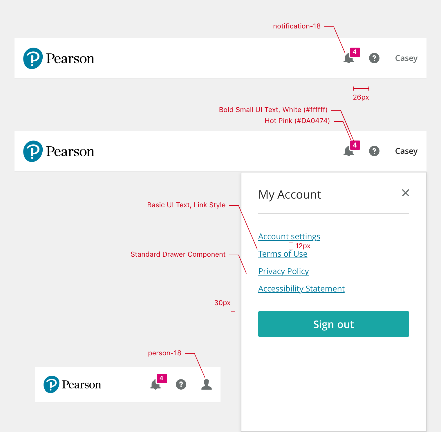 Represents the default signed in experience. Expands on the Signed Out Mode by making the Pearson Logo a home link (currently www.console.pearson.com) and including the User Menu.
