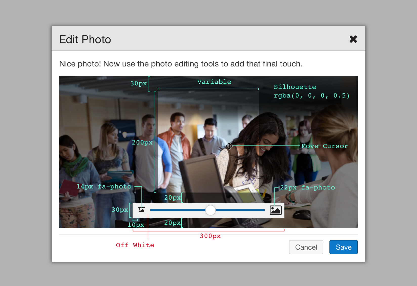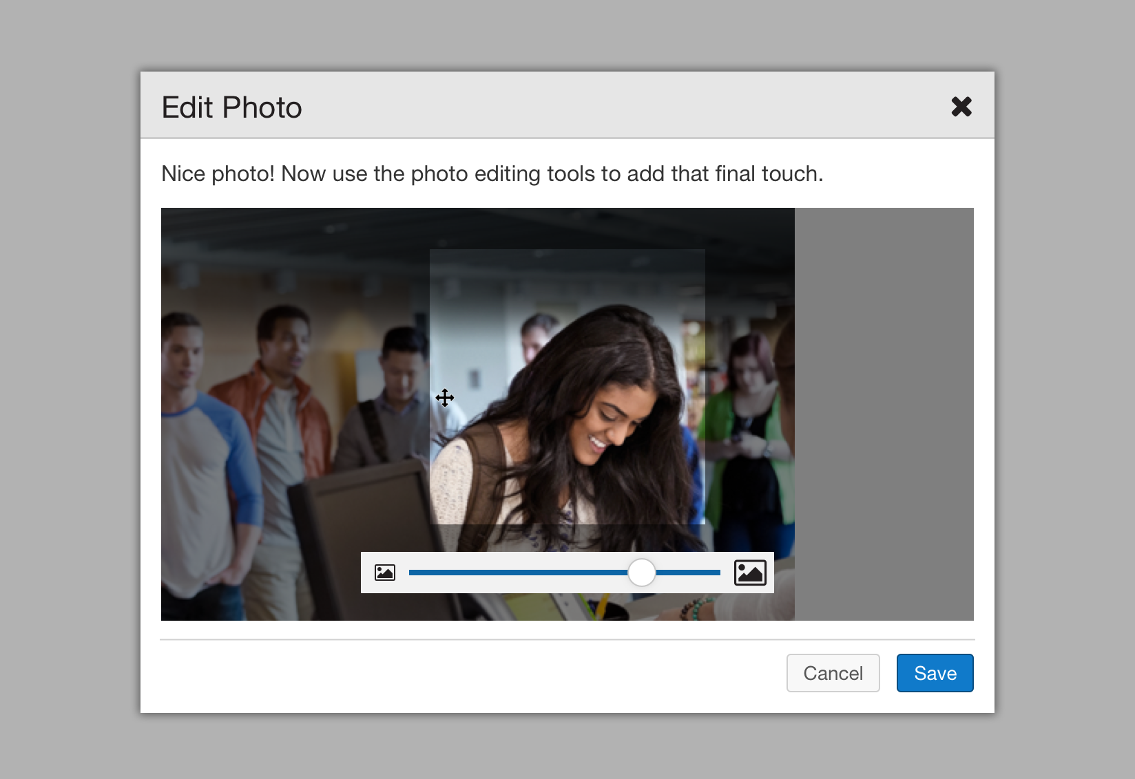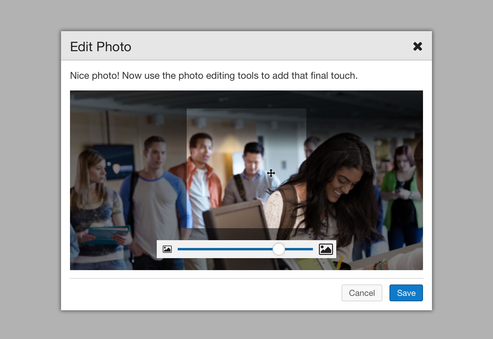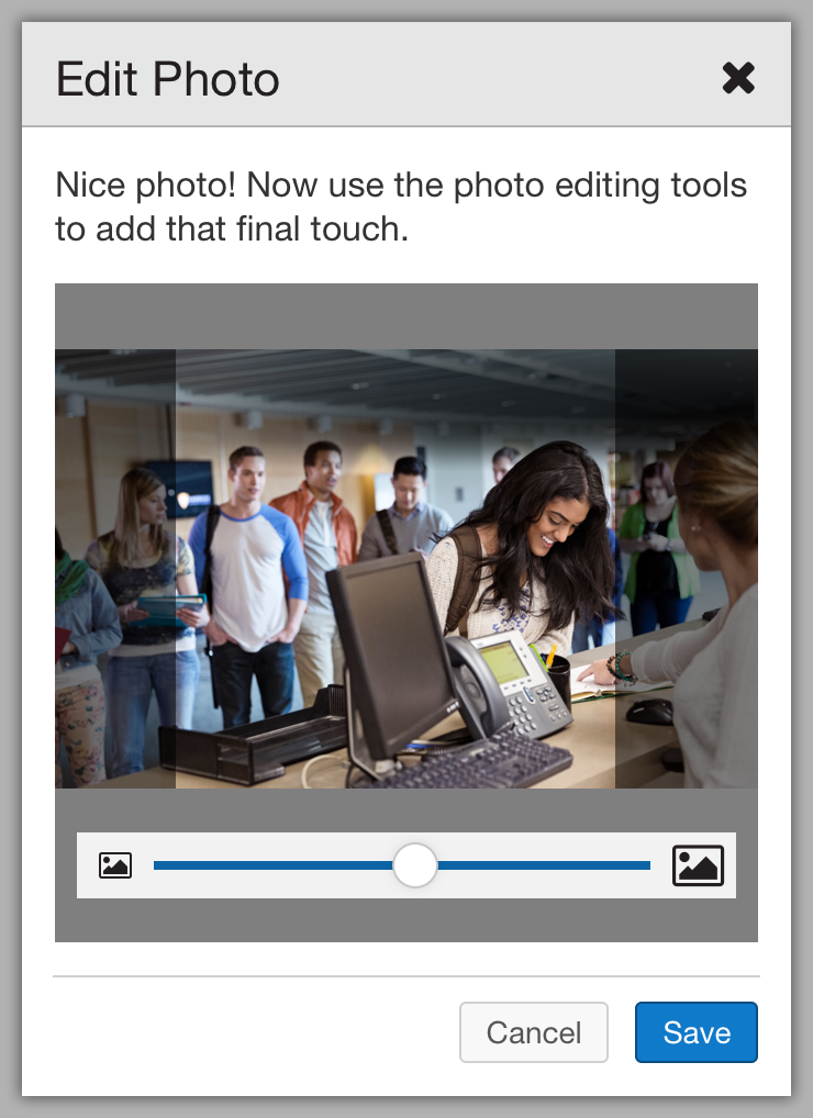 A photo may be scaled from 50% to 200% in size by clicking and dragging the slider towards the bottom of the Edit Photo modal.