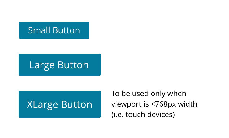 Buttons come in small, large and xlarge sizes. Prefer the small size but feel free to use the large size where they would fit better with surrounding content. Both small large button sizes are meant to pair with equally sized inputs. XLarge buttons are to be used when the UI appears on a mobile device or screen smaller than 768px width (tablet portrait view).