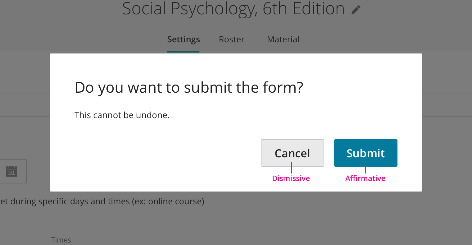 In some situations, destructive actions such as “delete” or “leave” may be affirmative actions. For example, an instructor attempts to delete a course. A modal shows up to confirm the action and make sure the instructor understand the consequences followed by the action. In such case, the “delete” button is an affirmative action.