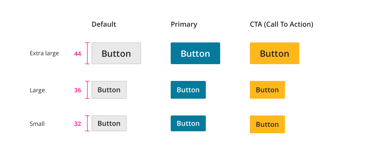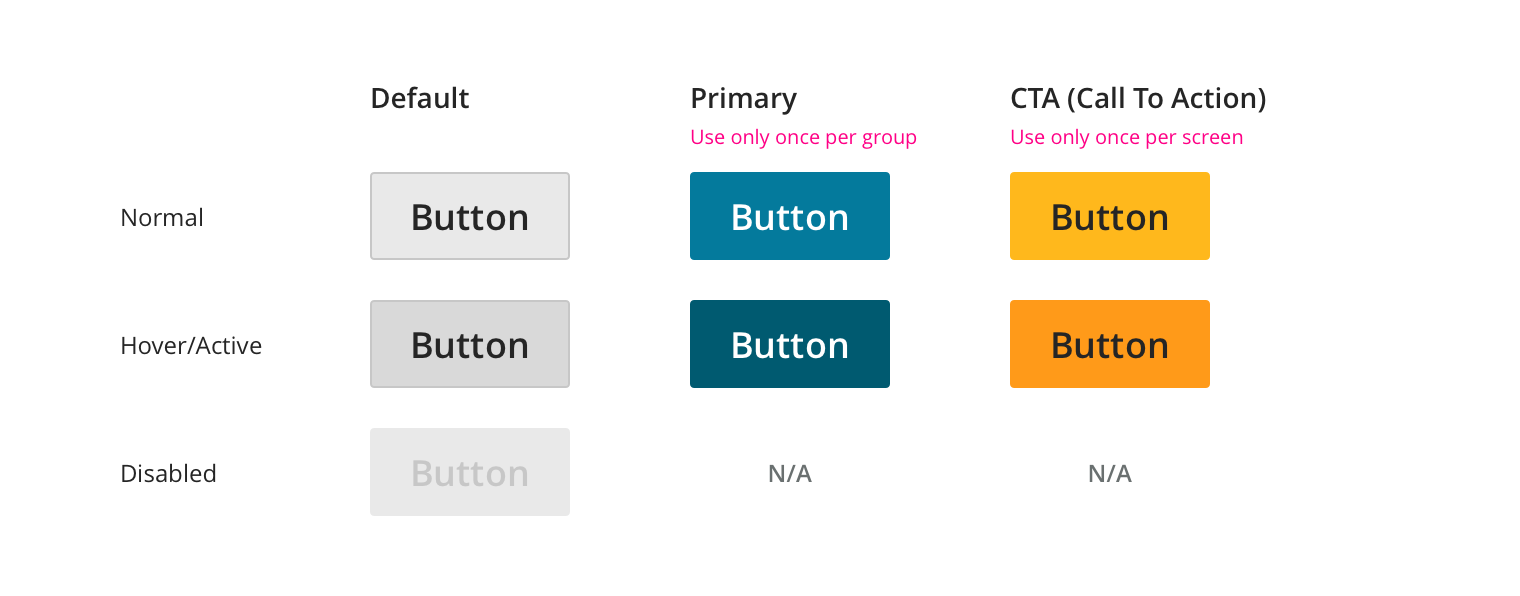 • CTA button is your Call To Action button. It is the single most important action on the page and takes higher priority over the Primary button type. It should be used only in specific instances such as the Sign-In process. It can only be used once per page.