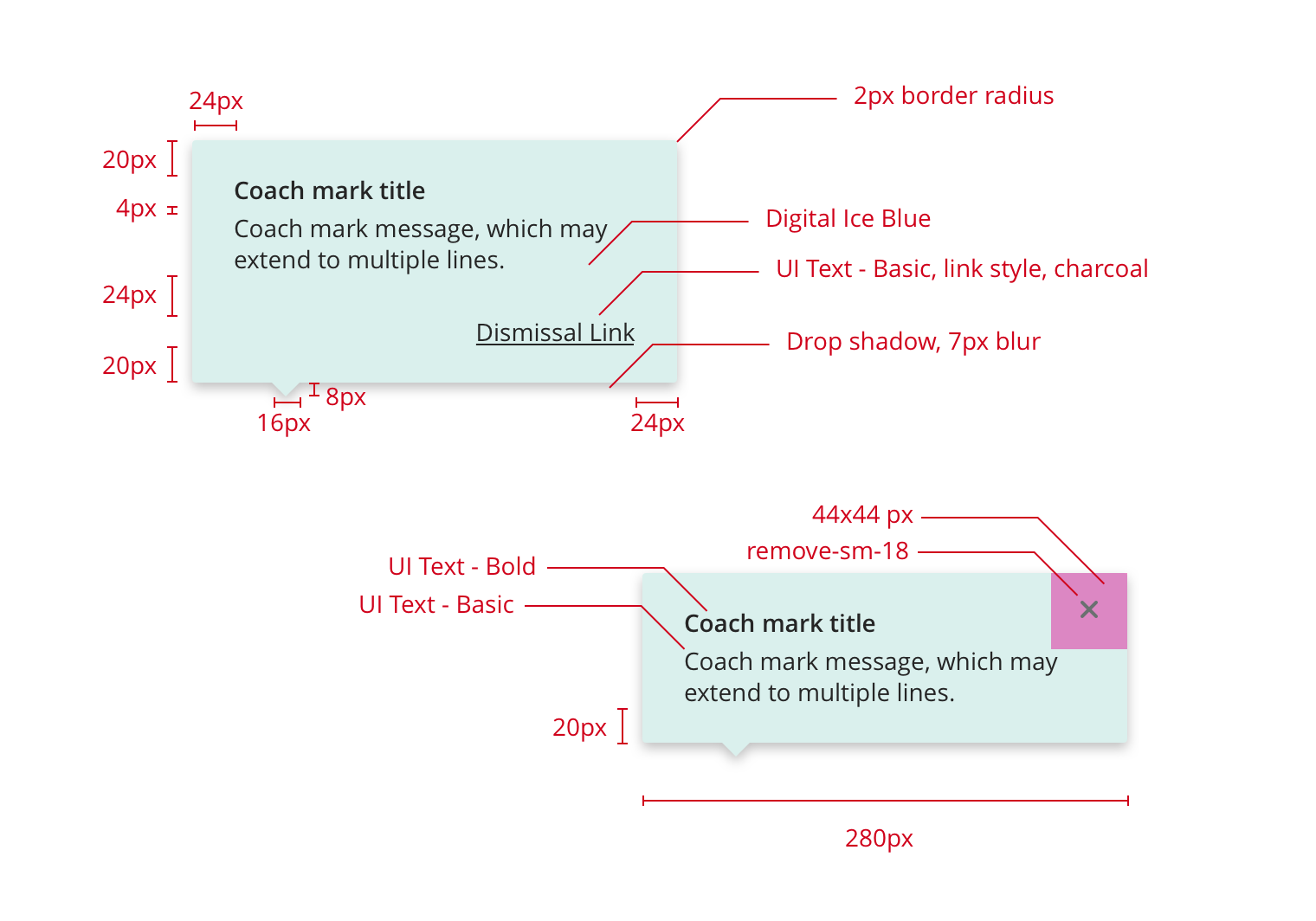 Either the link or close icon should always be present, but the coach mark may also be dismissed when the user interacts with the targeted part of the UI. This is mostly useful for introducing new features or prompting users to take a specific action.