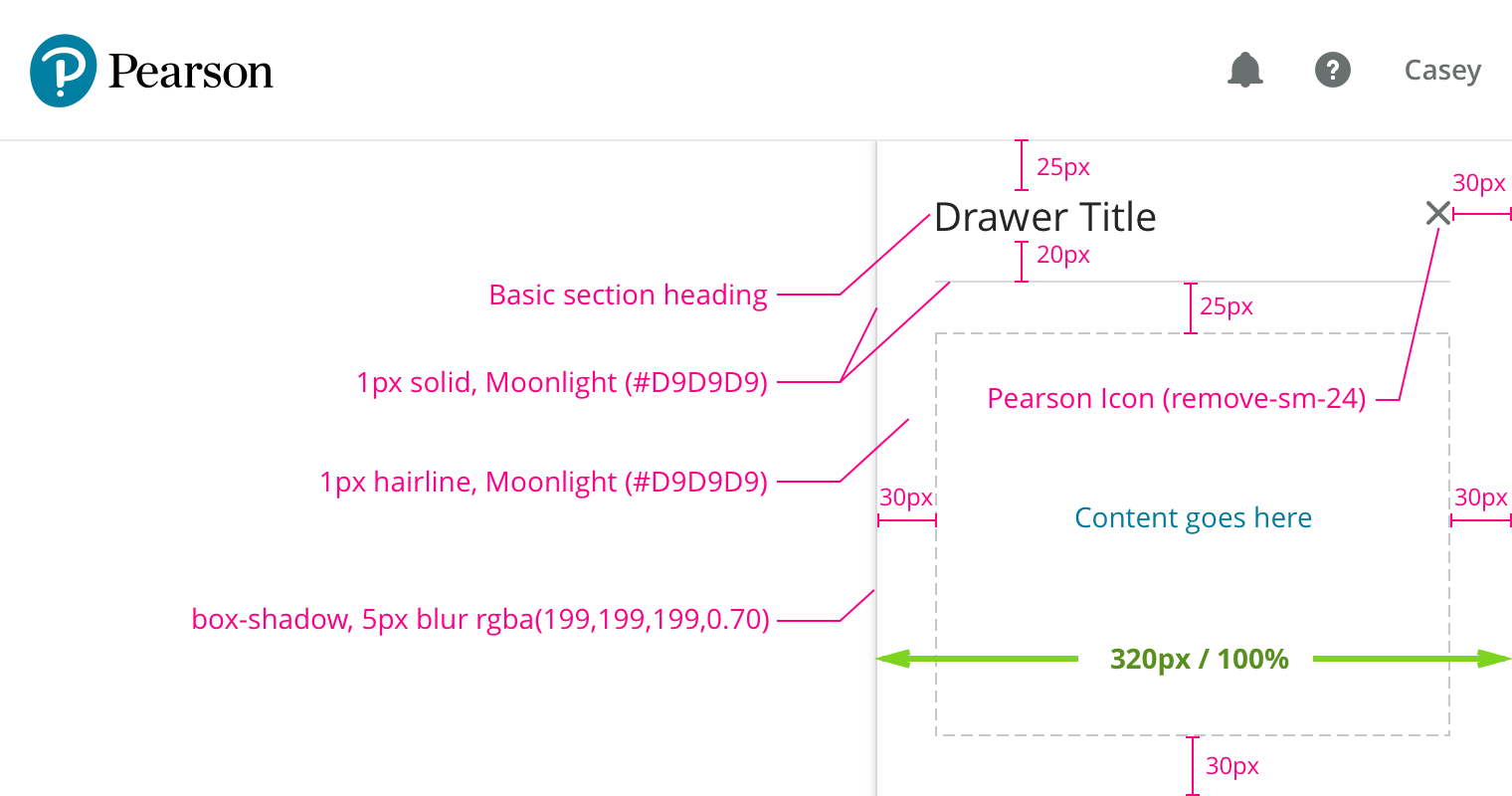 • Drawer is 320px wide at the Small breakpoint and wider