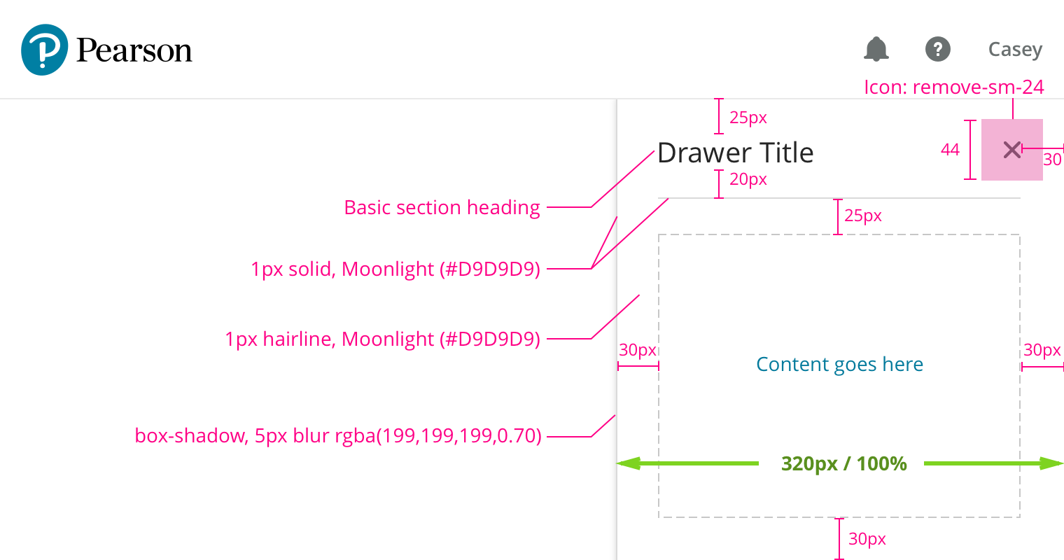 • Drawer is 320px wide at the Small breakpoint and wider