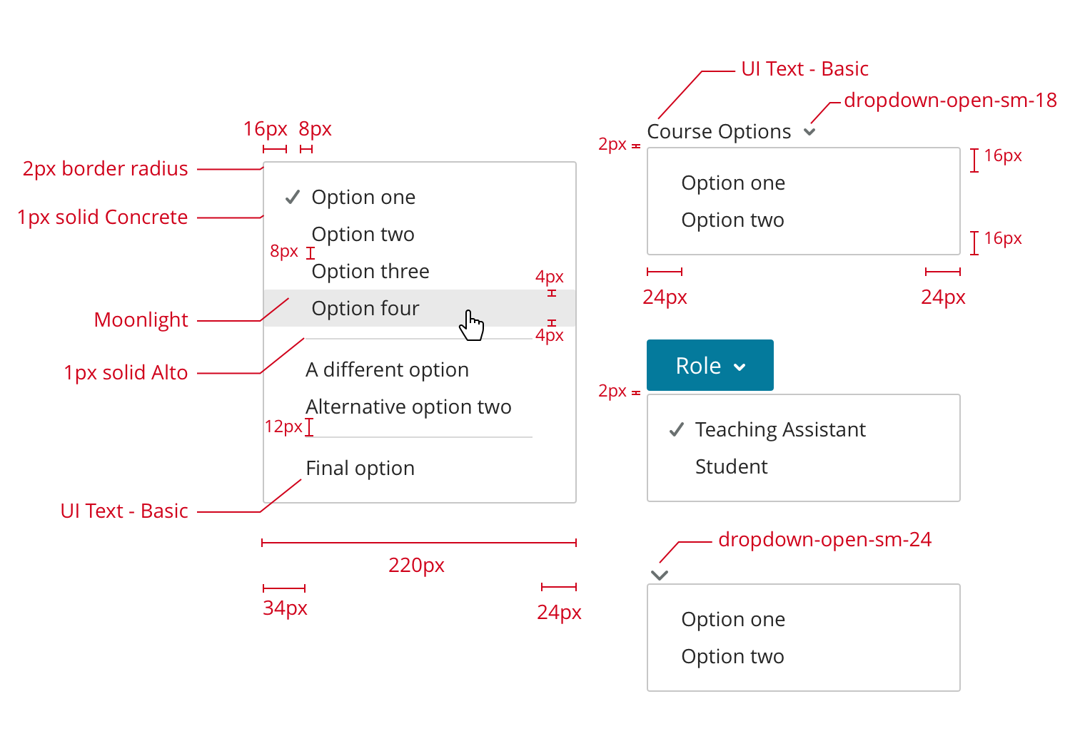 Opening a dropdown presents a simple list of textual options. These may be divided into logically related groups, and a single option may be indicated as selected with a checkmark.