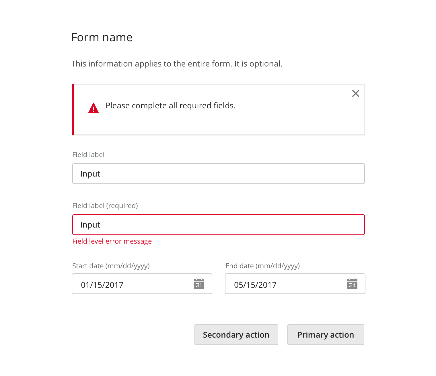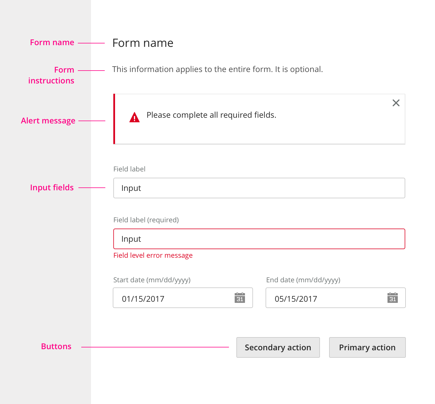The basic form consists of several parts: a form name, an optional set of form instructions, an optional alert message, one or more input fields, and primary/secondary action buttons.