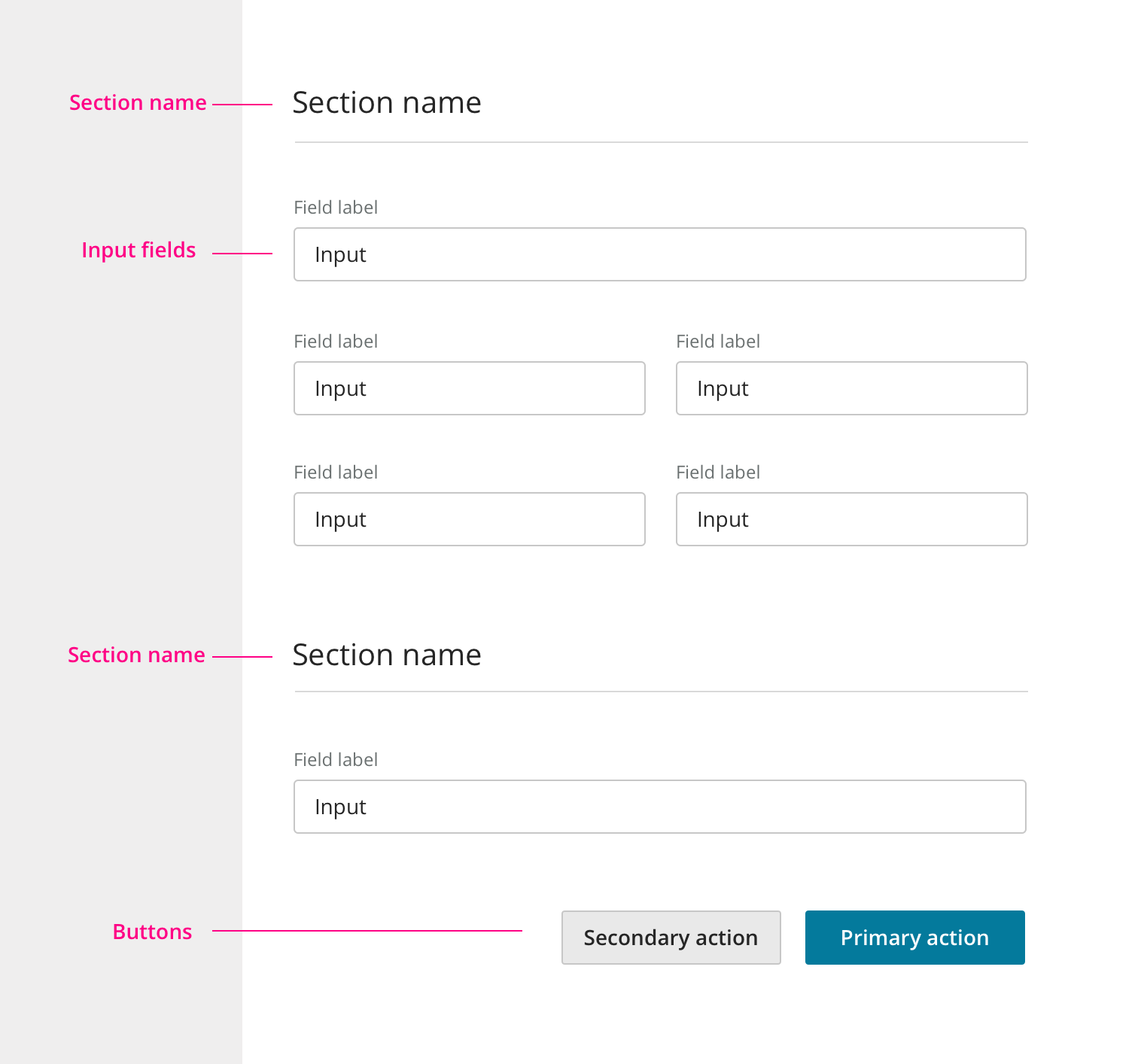 If you have many fields, consider organizing related fields into groups. Each group can have a section name. A form group consists of a section name followed by a horizontal line and input fields.