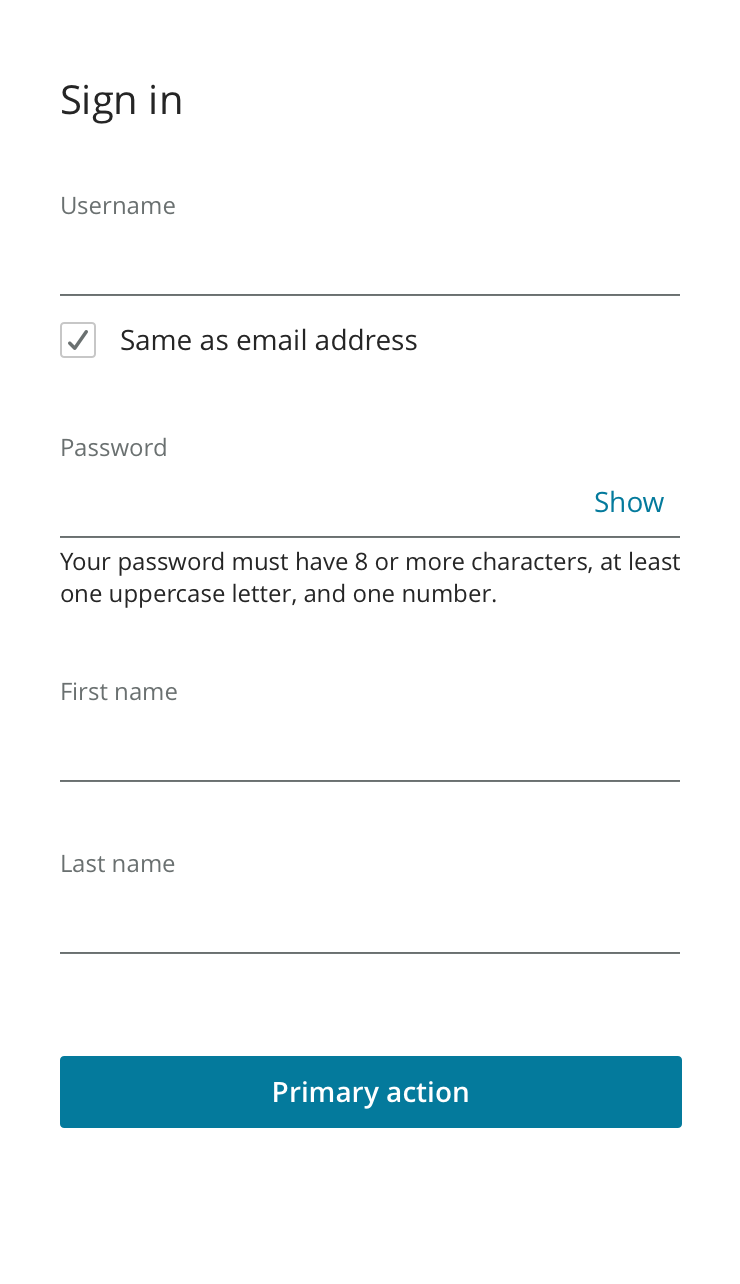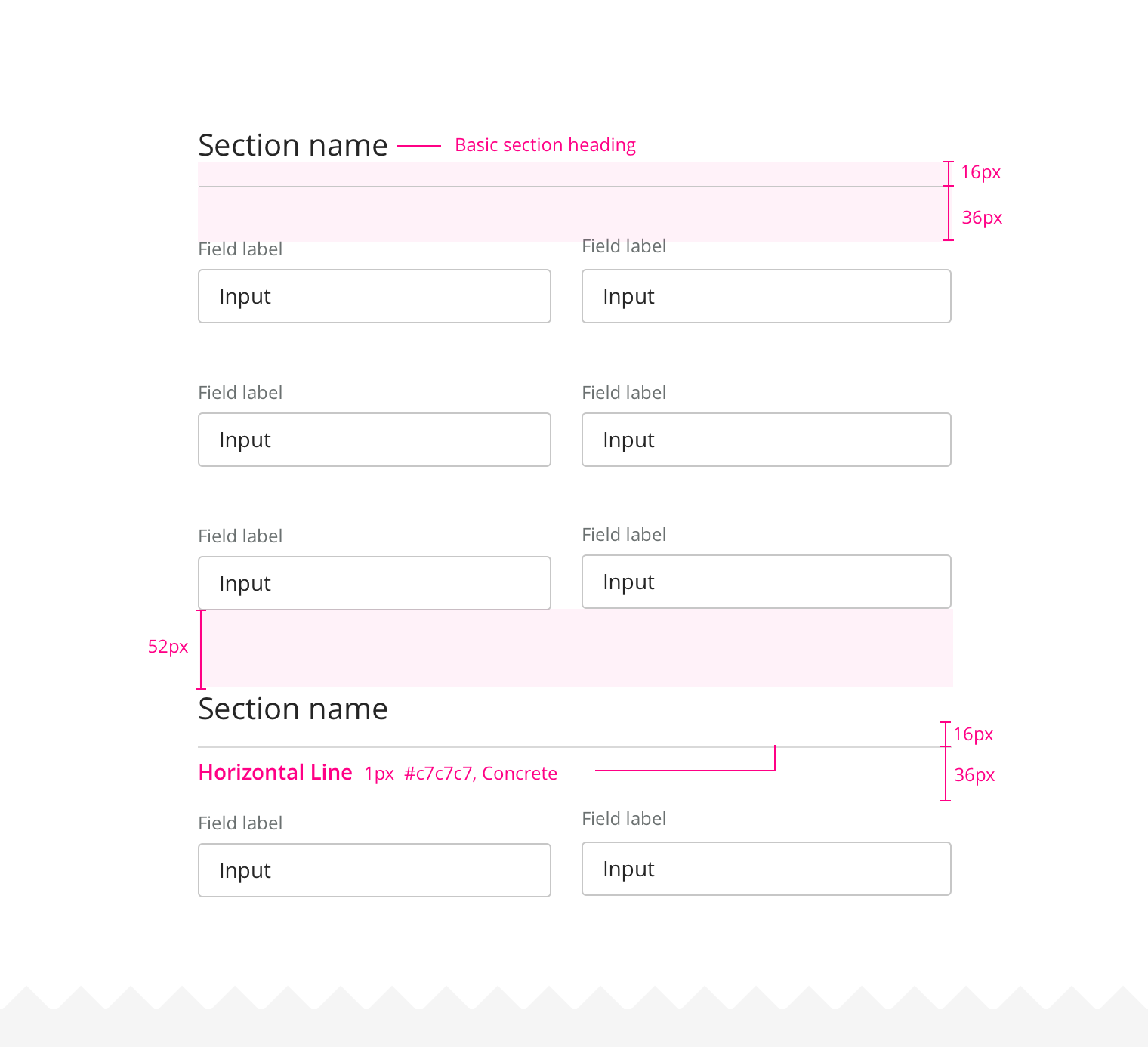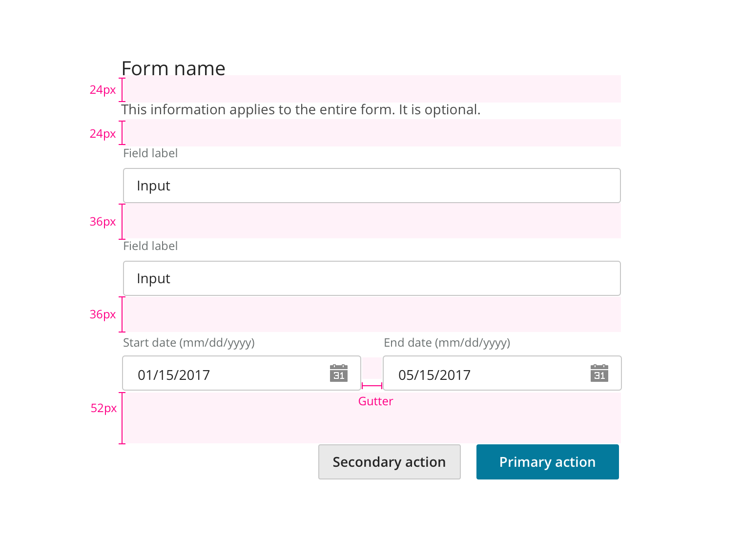 • 36px between all inputs (this includes space dedicated for one line of error text)