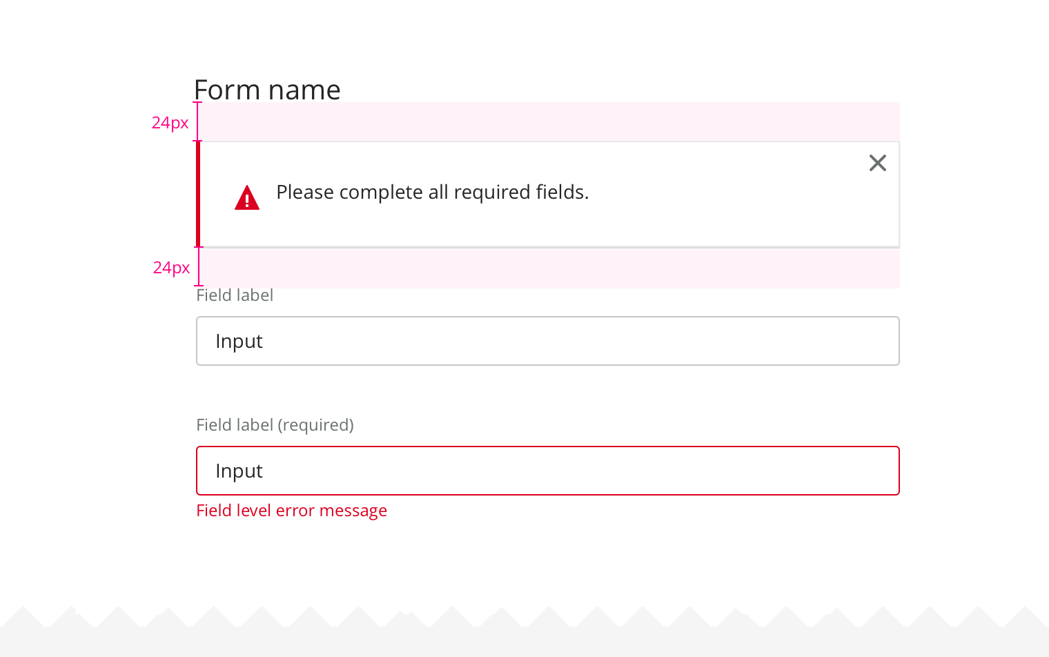 Individual input fields should present their own errors following the styles dictated in the Inputs component. Fields with errors should always be accompanied by an error, unless a top level error message is sufficient to understand and fix the problems.