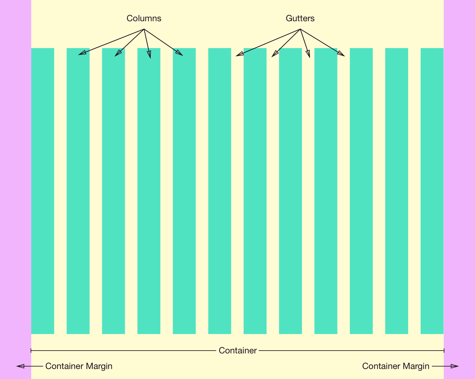 The grid consists of four key parts: the Container, Container Margins, Columns, and Gutters.