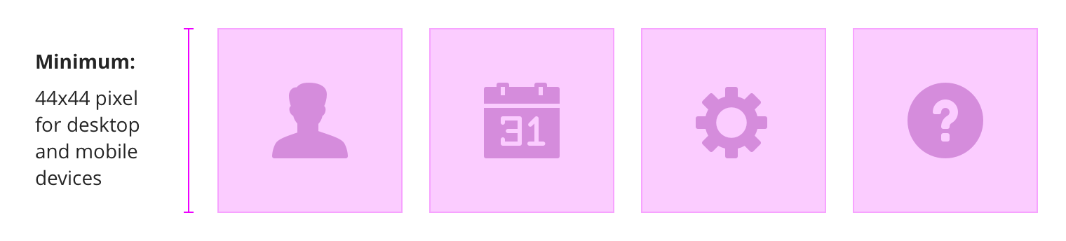 You can use Pearson icons as buttons. To ensure accessibility across desktop and mobile devices, a minimum touch target, 44 x 44 pixel, is required for each icon.