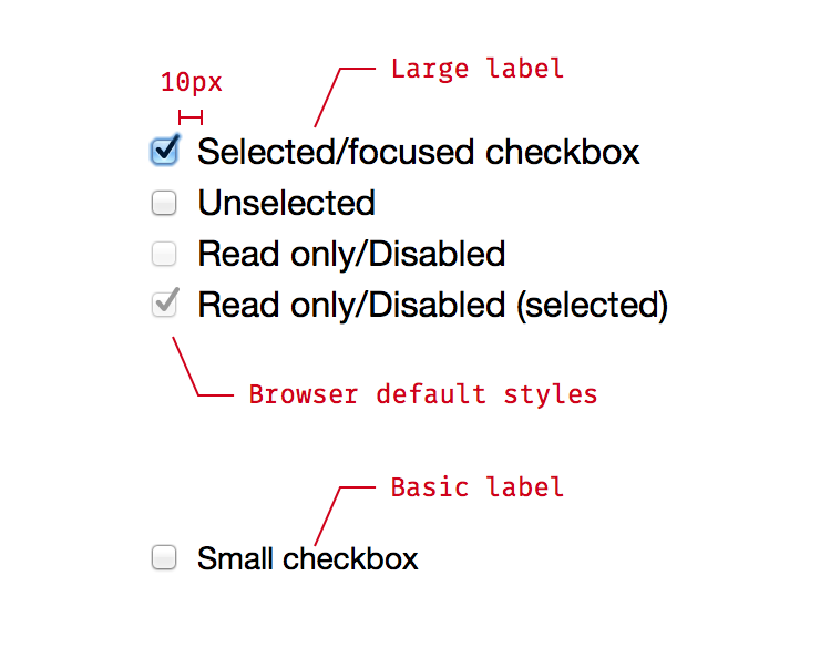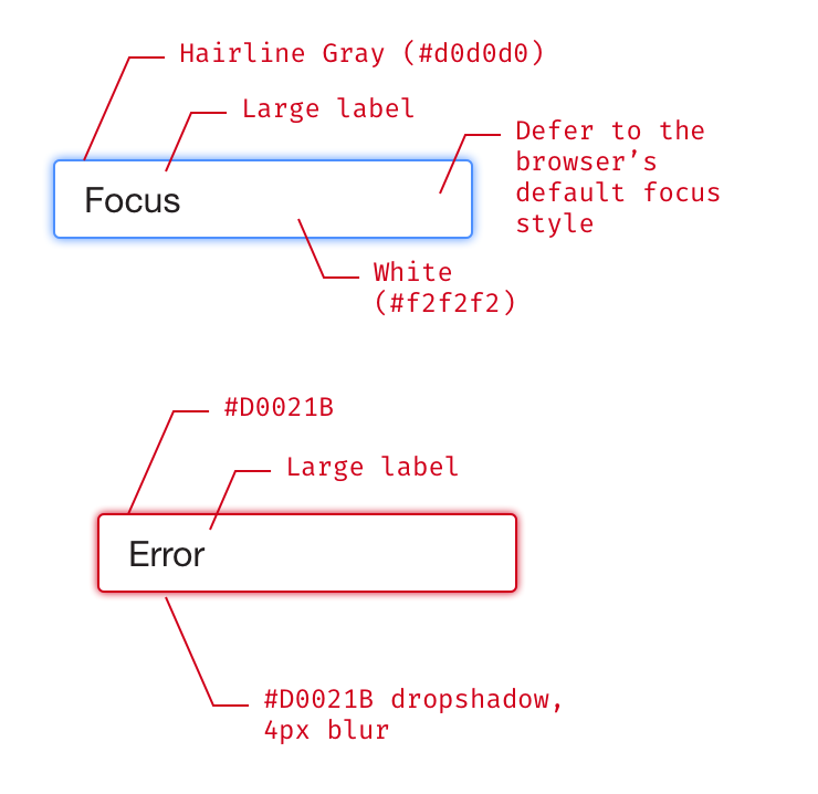 • Error states must be accompanied by explanatory text. See the forms component for standard examples of error handling.
