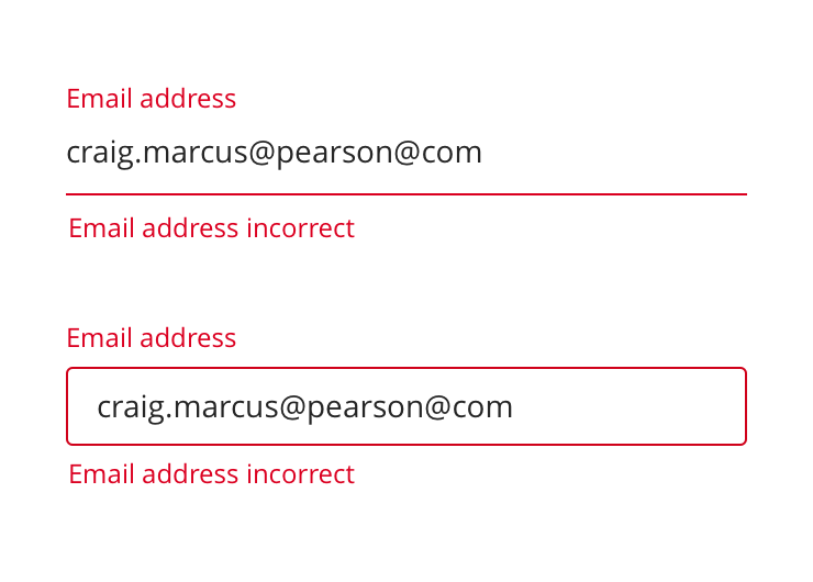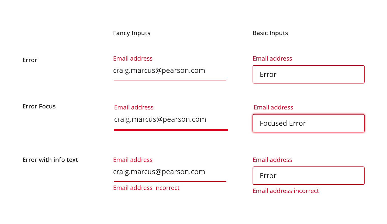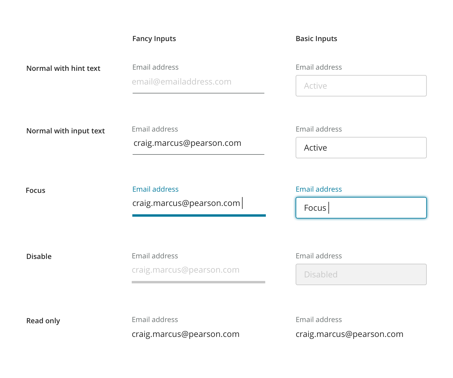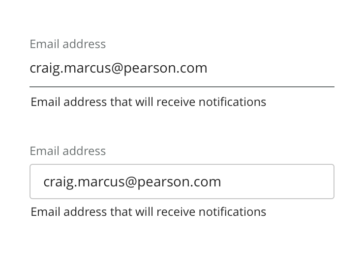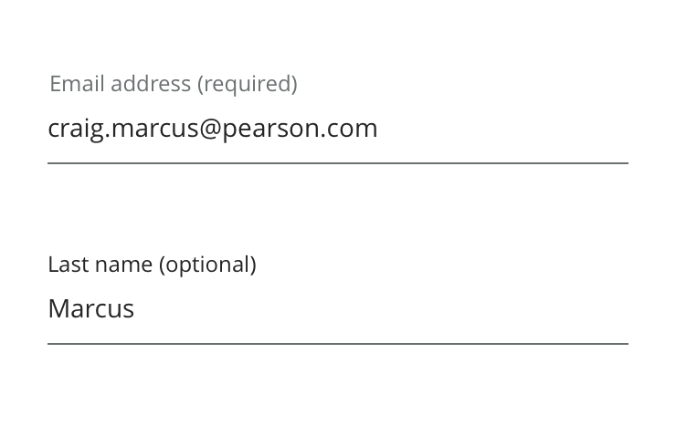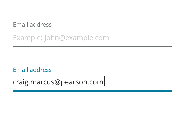 Inputs come in two styles, Fancy and Basic. Most situations should use the basic style, fancy inputs are reserved for high-touch pages where it’s important to emphasize the Pearson brand (such as Sign In or Account Creation).