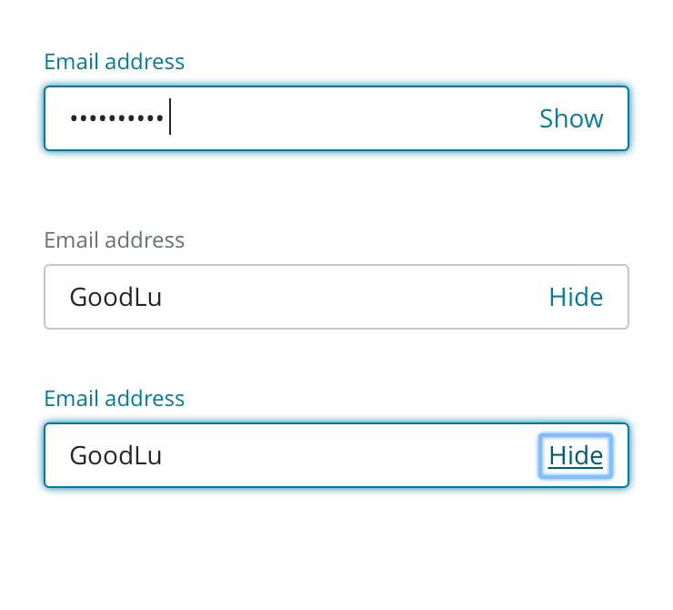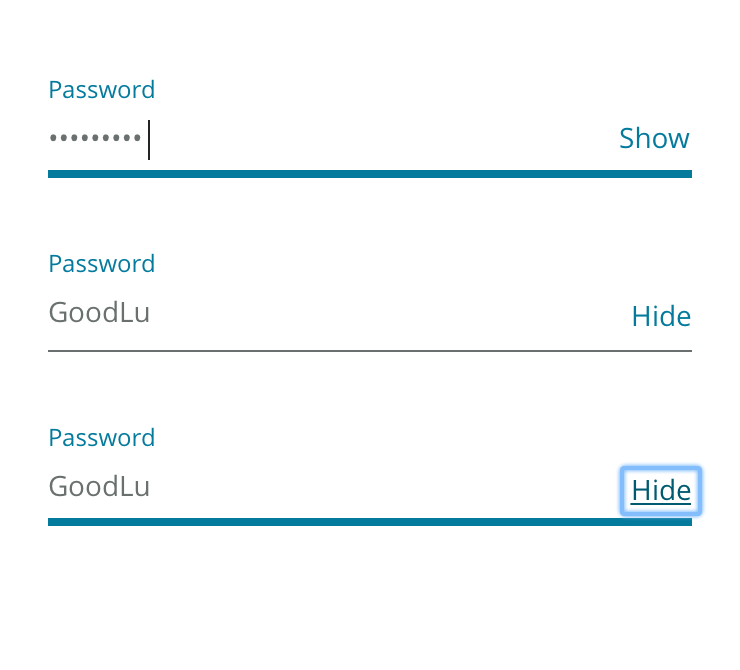 Note the show/hide control is slightly different than the standard link style with the underline appearing on hover/focus. This is to mesh with the fancy form style better.