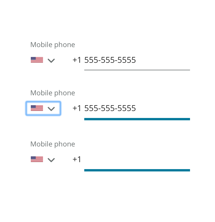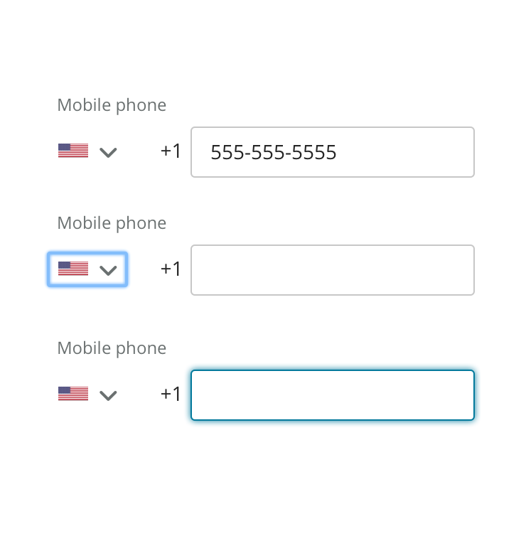 • Choosing a country in the dropdown updates the country code displayed next to the input