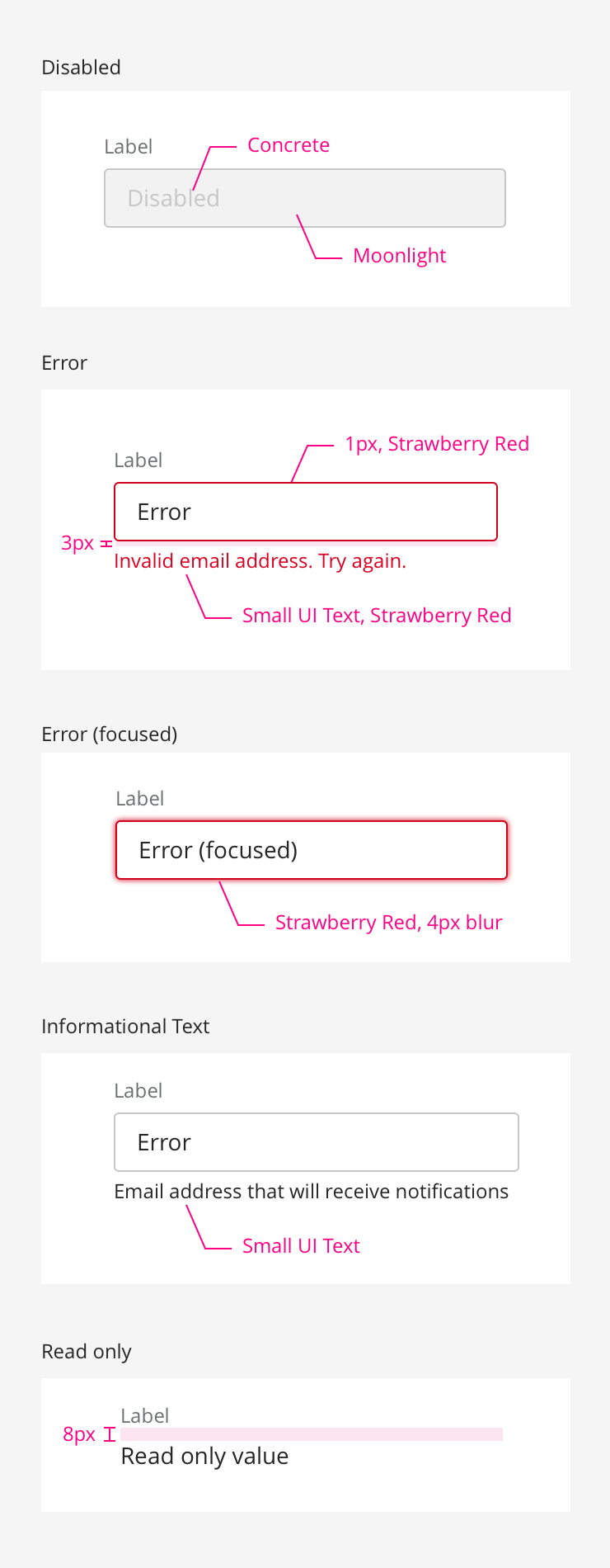 Error (focused) is the focused version of the error state. Note that in almost every case an error state should be accompanied by explanatory text. See the Informational/Error Text section section for more details.