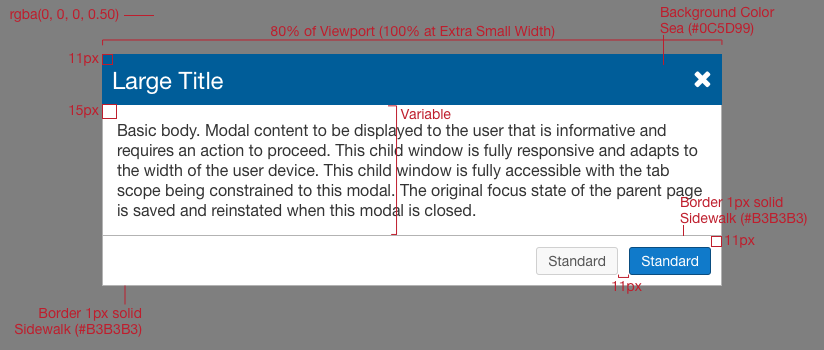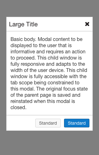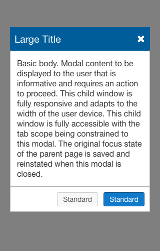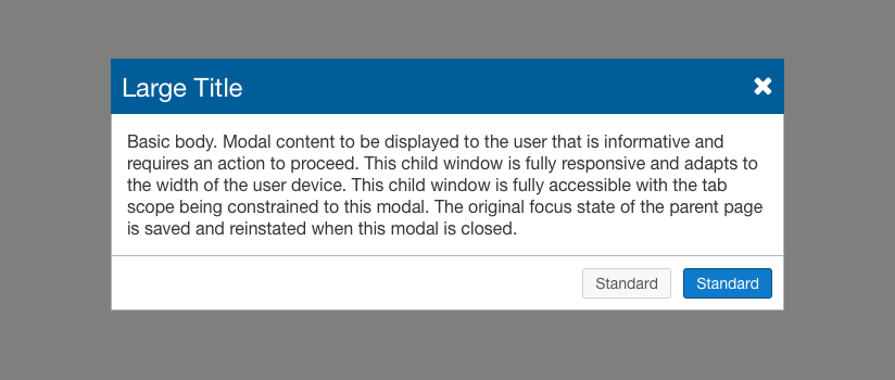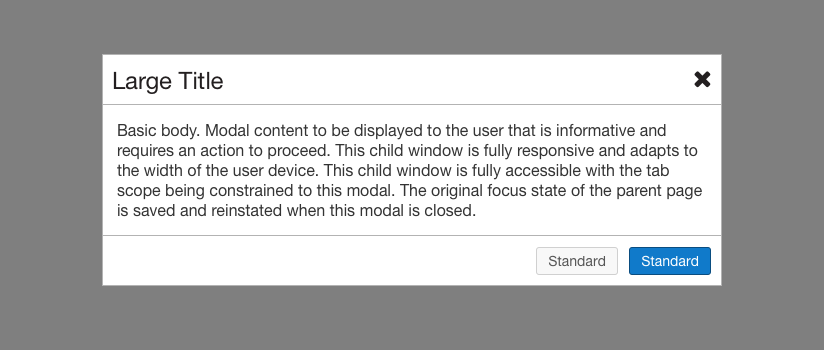 The default modal style is comprised of a title area with close button, a content area, and a footer area with actionable Standard Buttons.