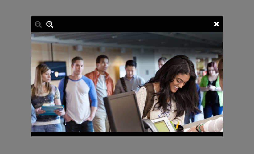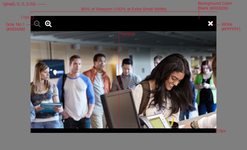The image modal is for image content. It replaces the title with zoom controls and has a Black (#000000) background color.
