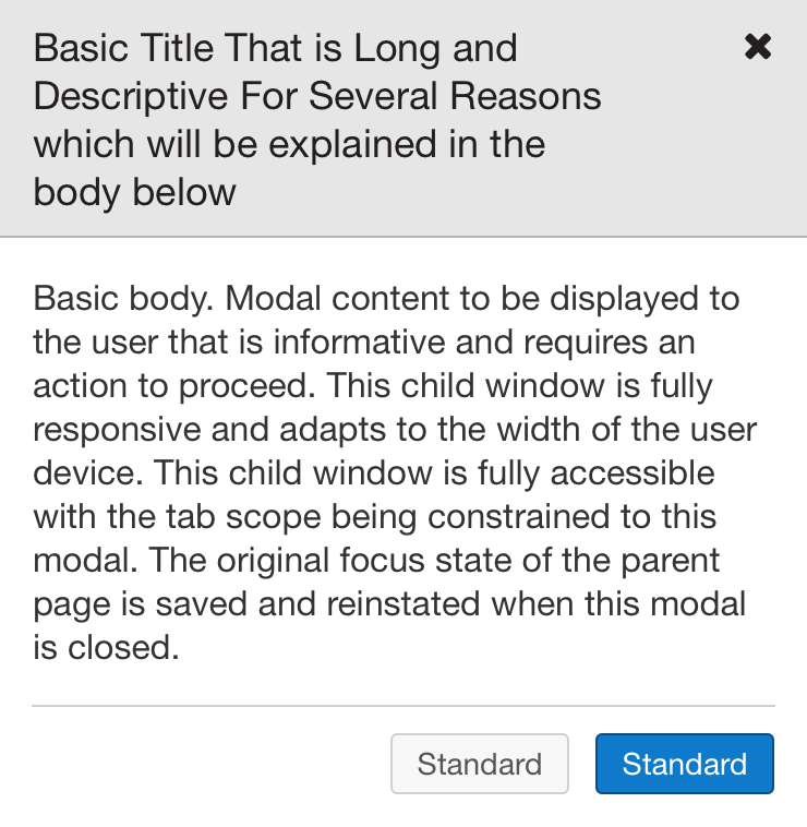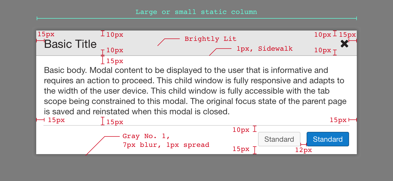 Modals, being a single-context item (they do not coexist with any existing page, but act as though they are their own page), will need the following attributes and settings: