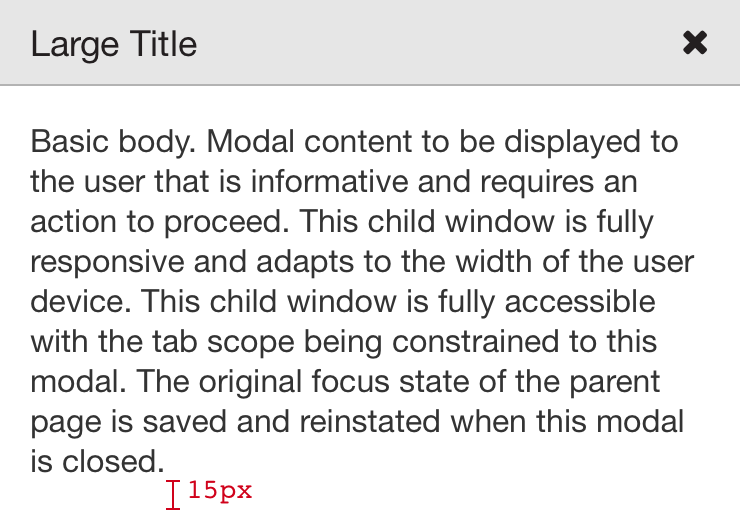 • Opening the modal freezes the position of any underlying content, scrolling should only apply to the modal itself