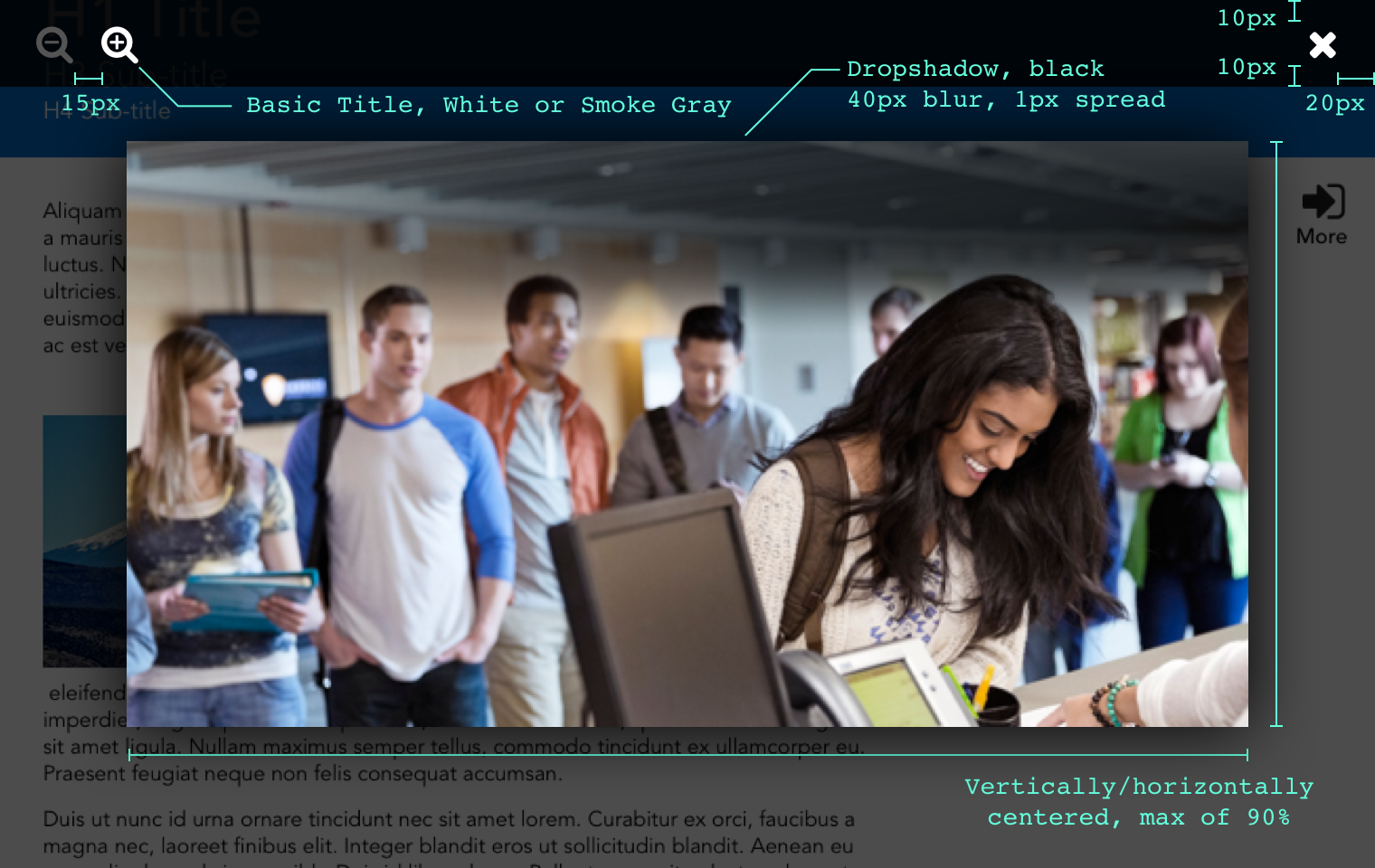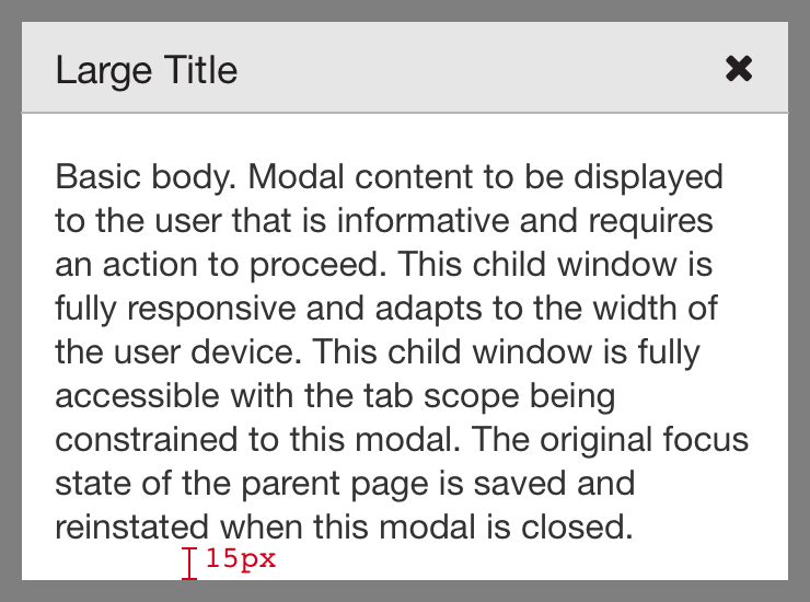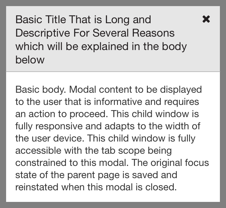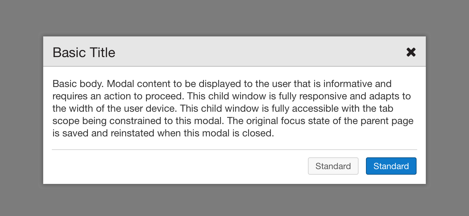 Modals, being a single-context item (they do not coexist with any existing page, but act as though they are their own page), will need the following attributes and settings: