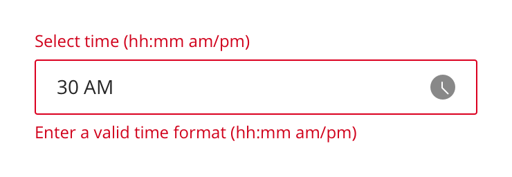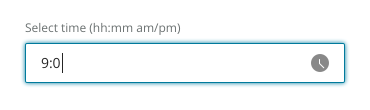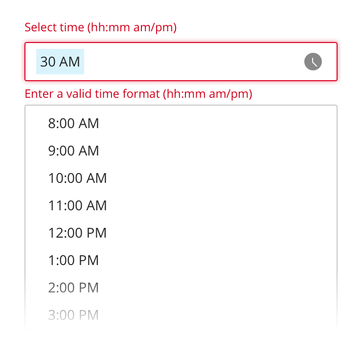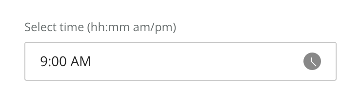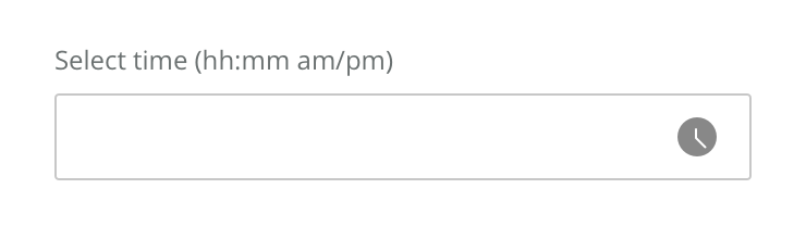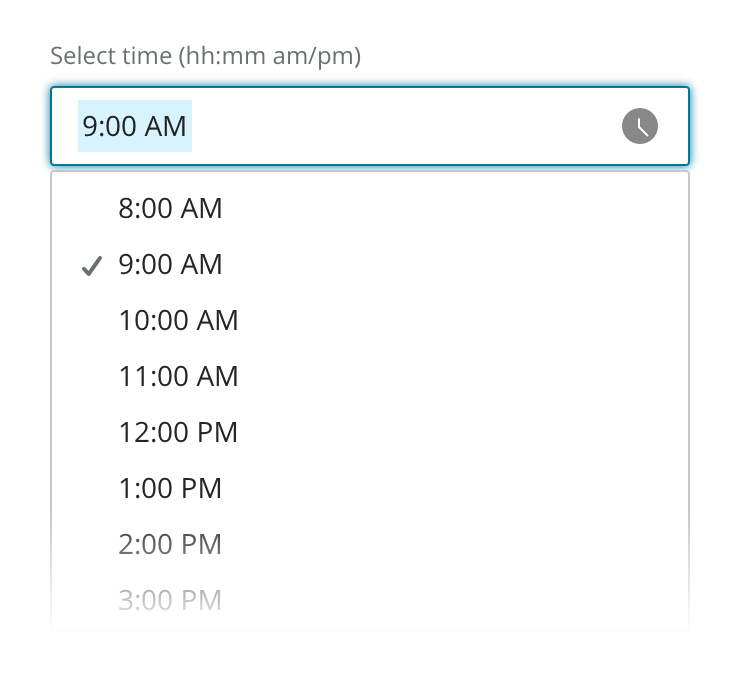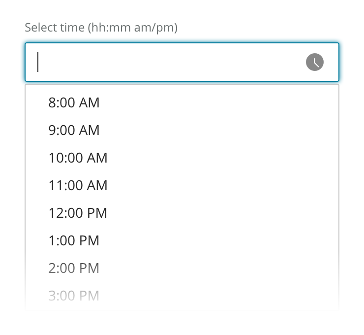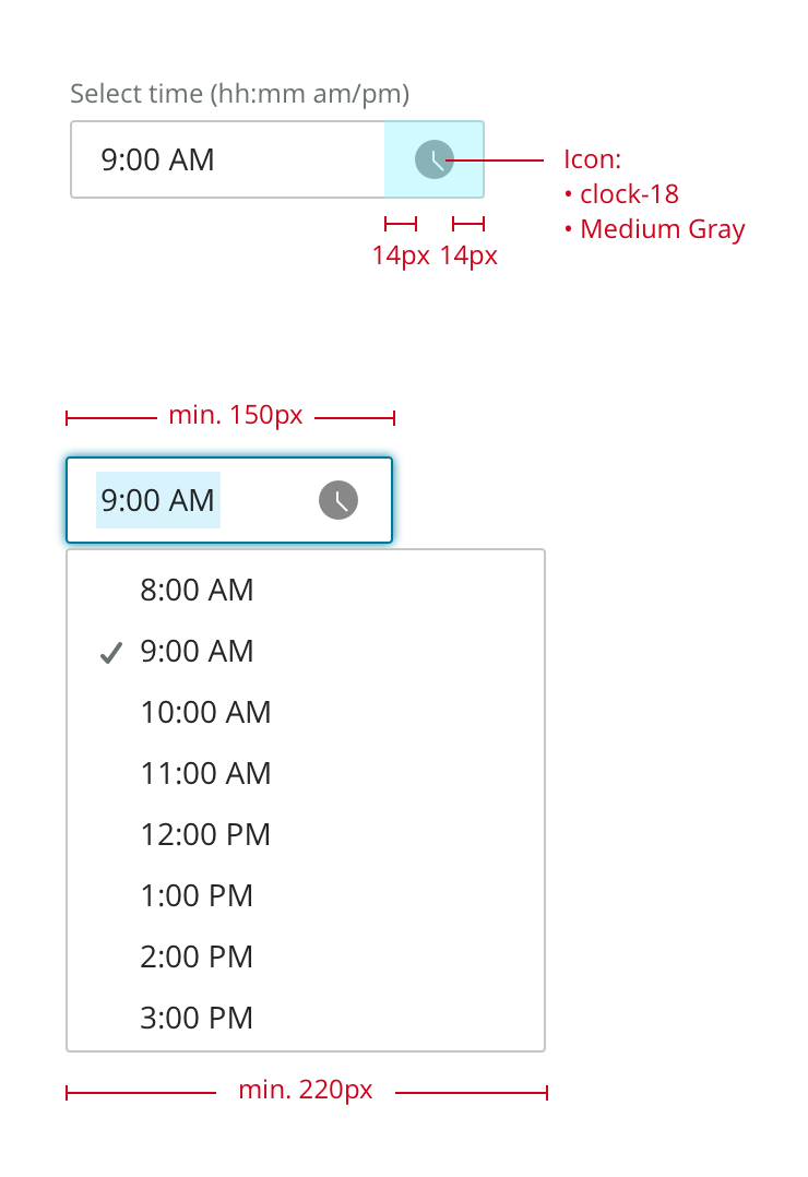 The single time picker consists of a specialized input field (including a time icon) and a dropdown component.