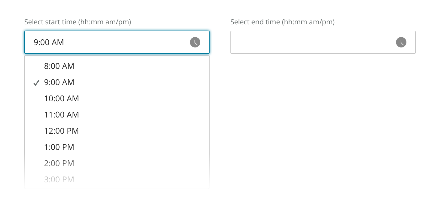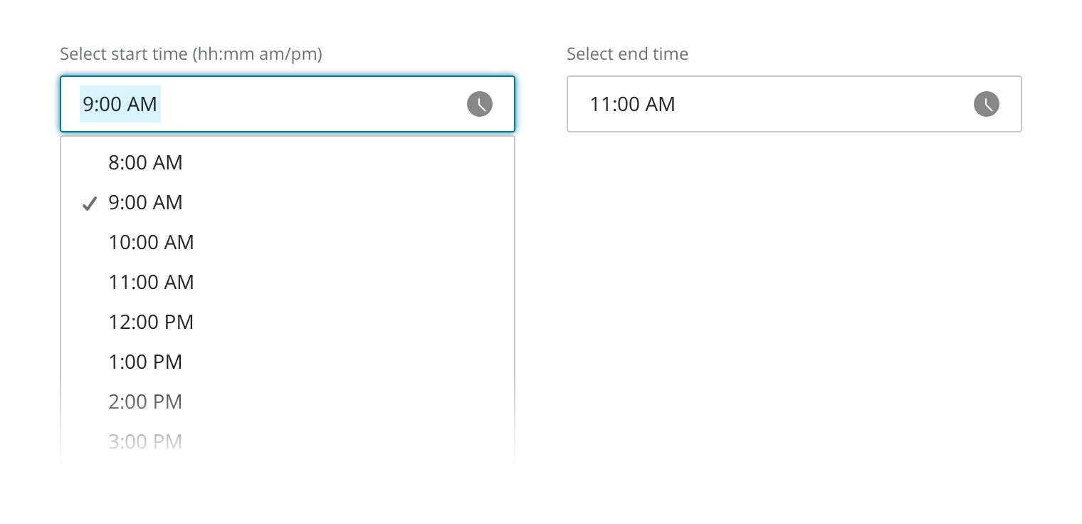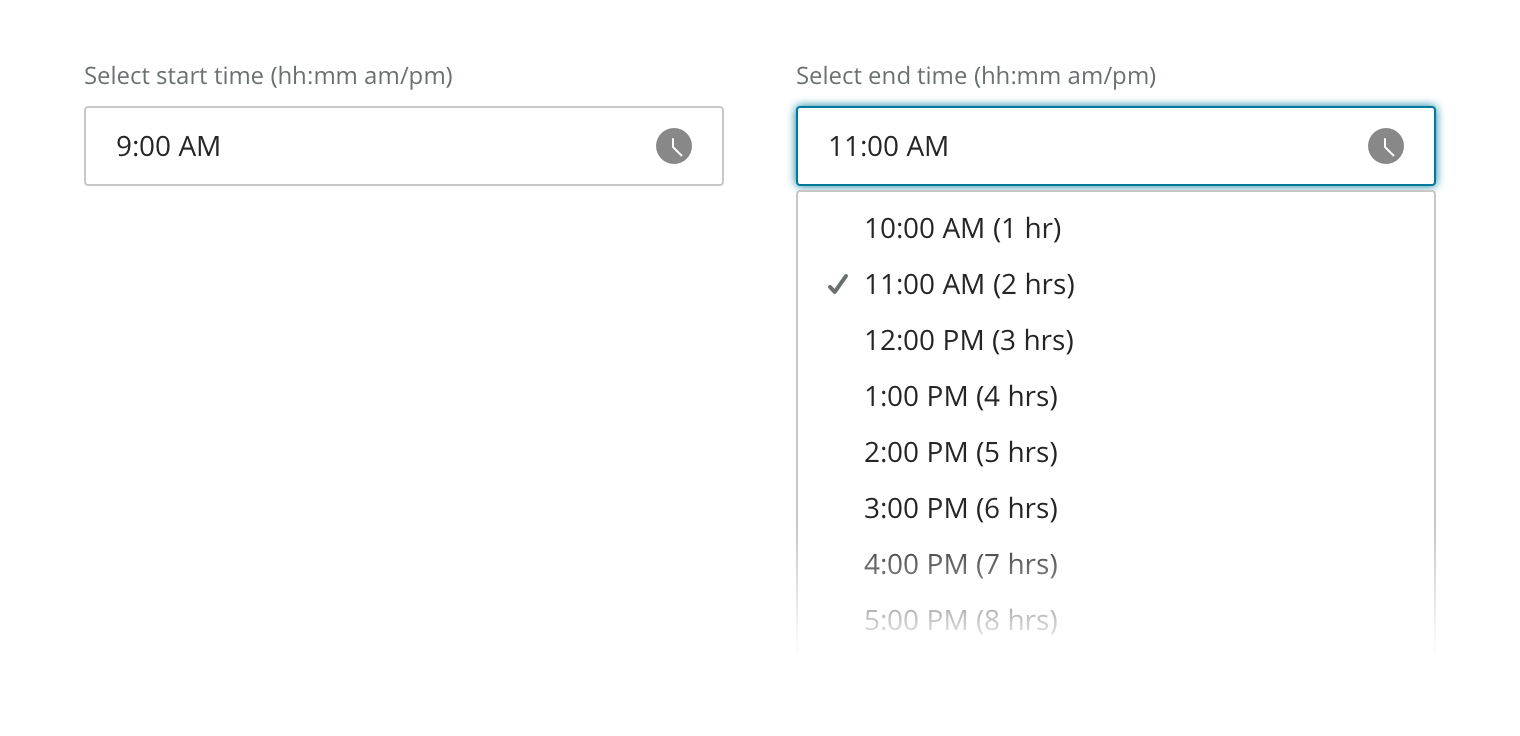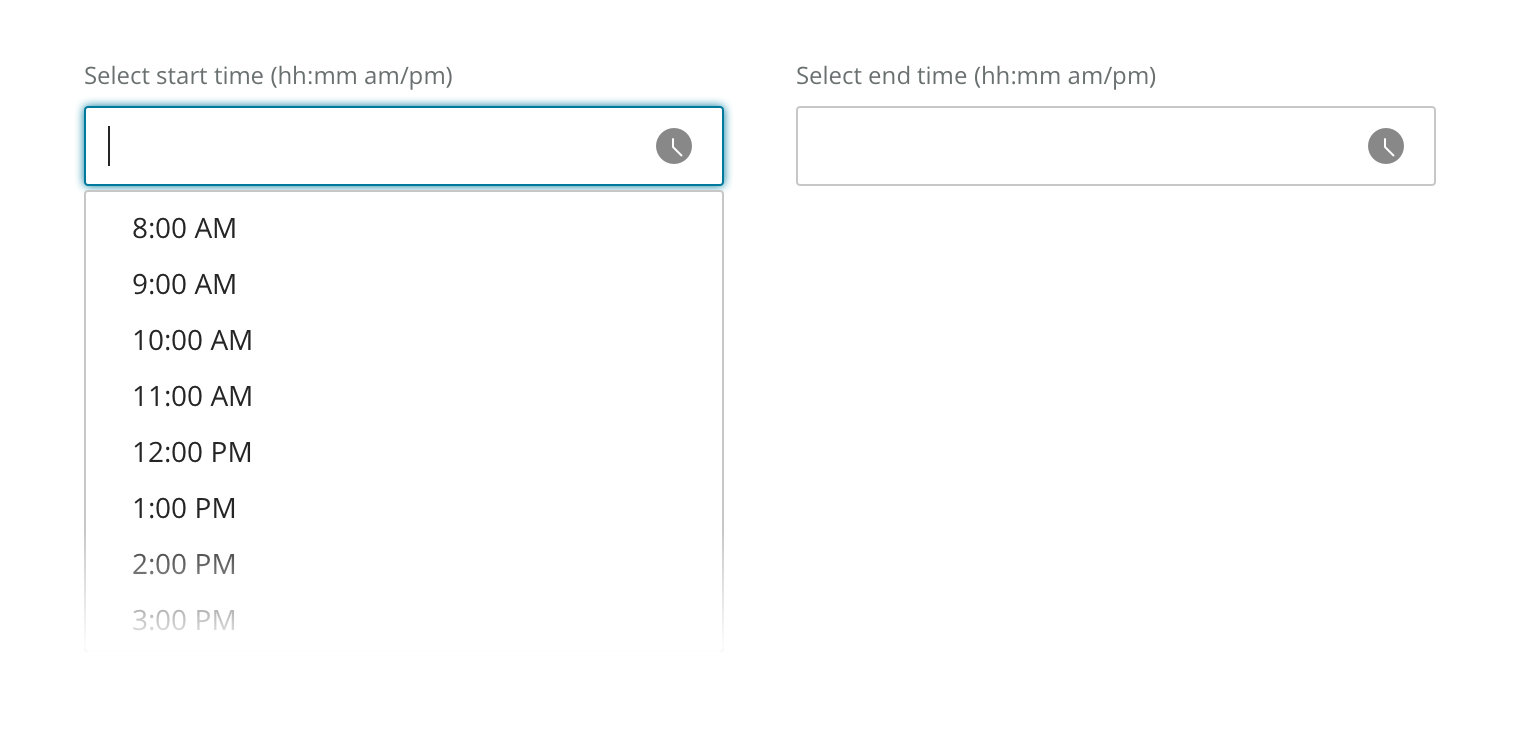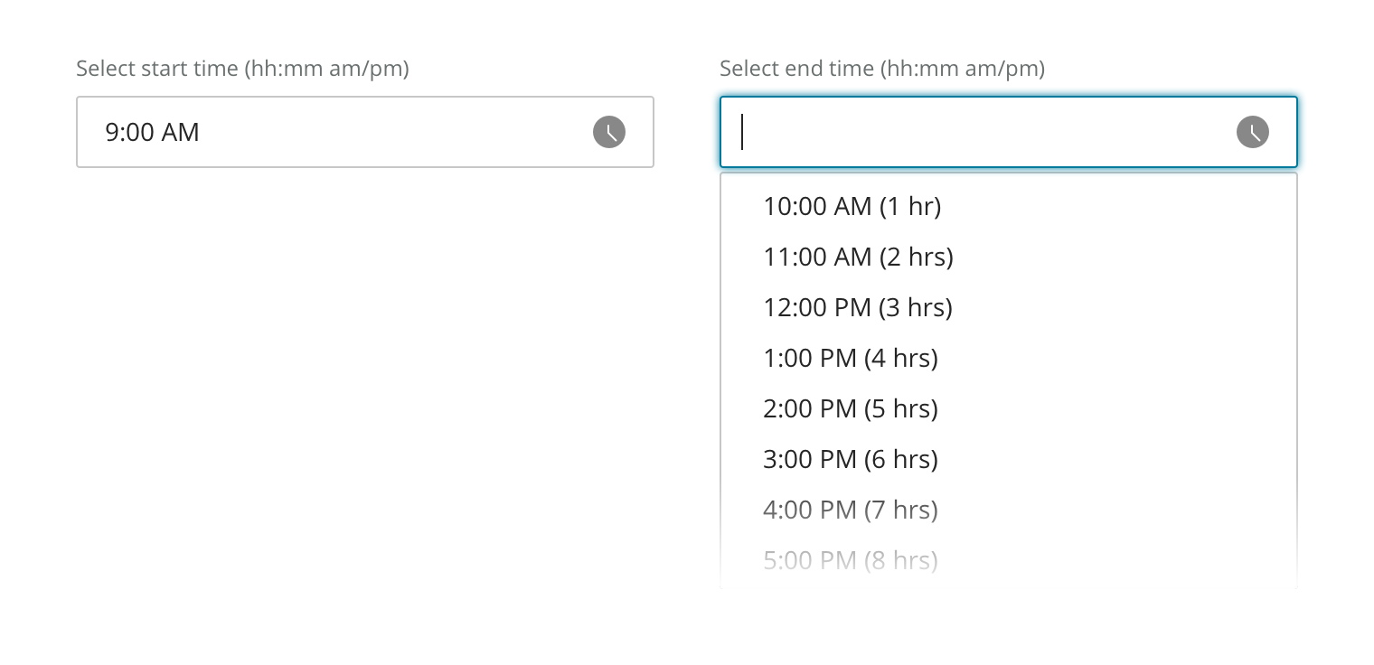Note that once the user has made a start time selection, focus should automatically switch to the end time and the dropdown for the end time should open. Time selected in the start time and prior will not be in the dropdown.