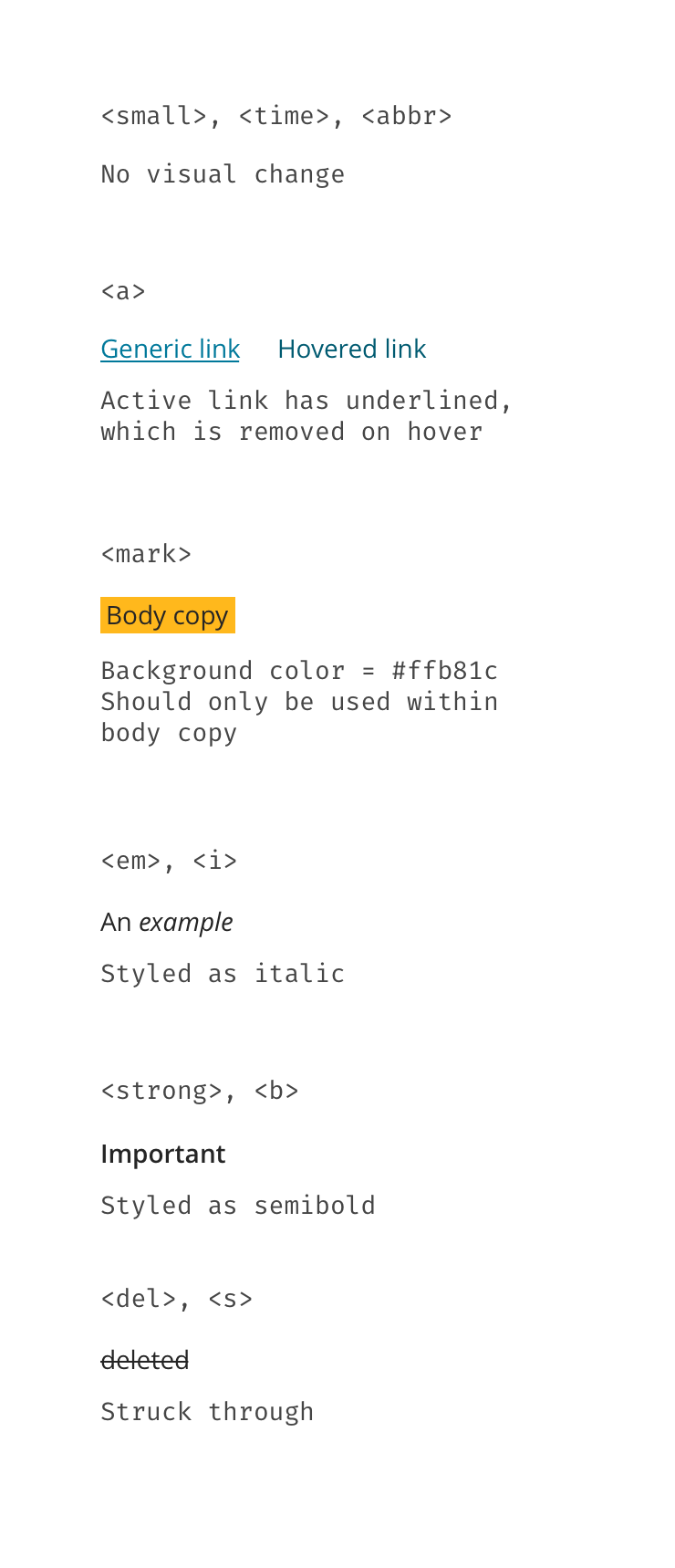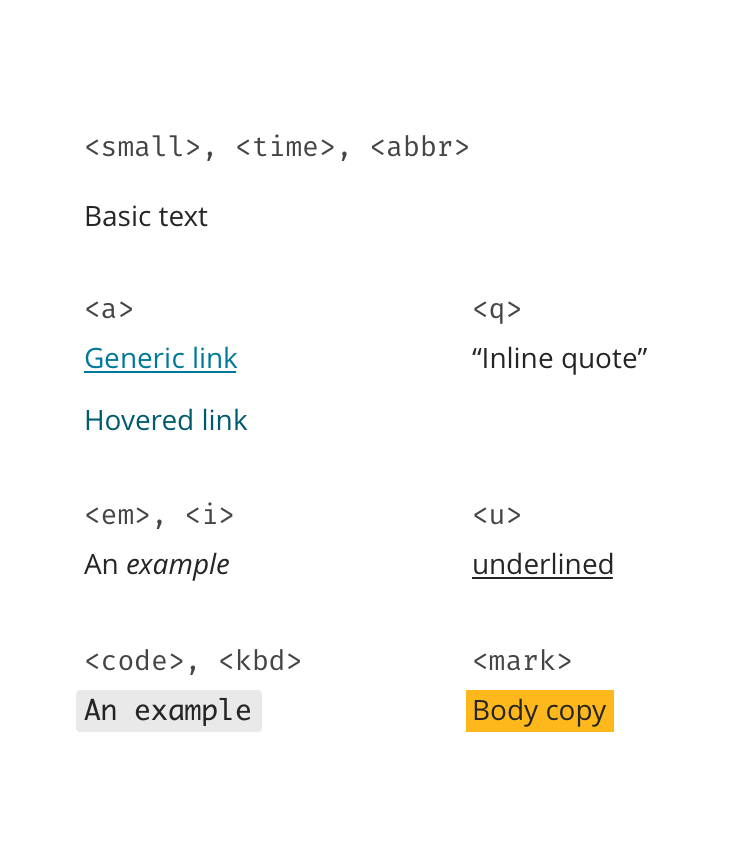 <small> (note: this element is used to represent side-comments and small print, including copyright and legal text, independent of its styled presentation)<time><abbr>Text is Charcoal by default, Medium Gray should be used as the secondary color. Any other color can be used as long as it’s paired with an appropriately contrasting background. See the Colors component for more details.