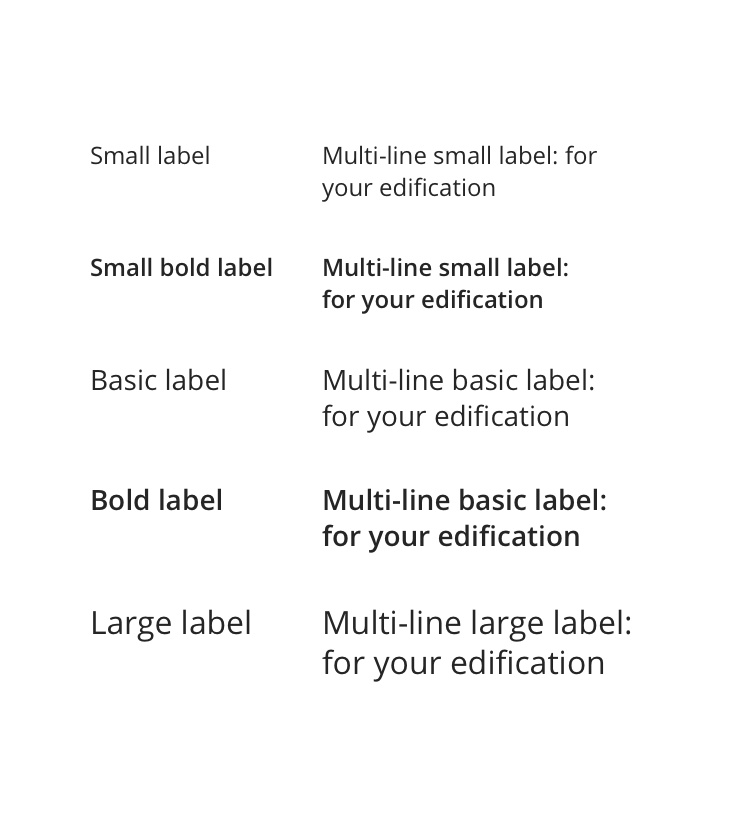 There are five different types of label, Basic, Small, Large, Bold, and Small bold: