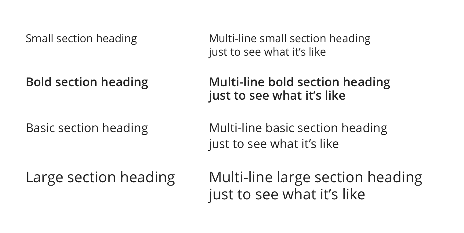 Standard Section UI Heading types in single and multiline versions.