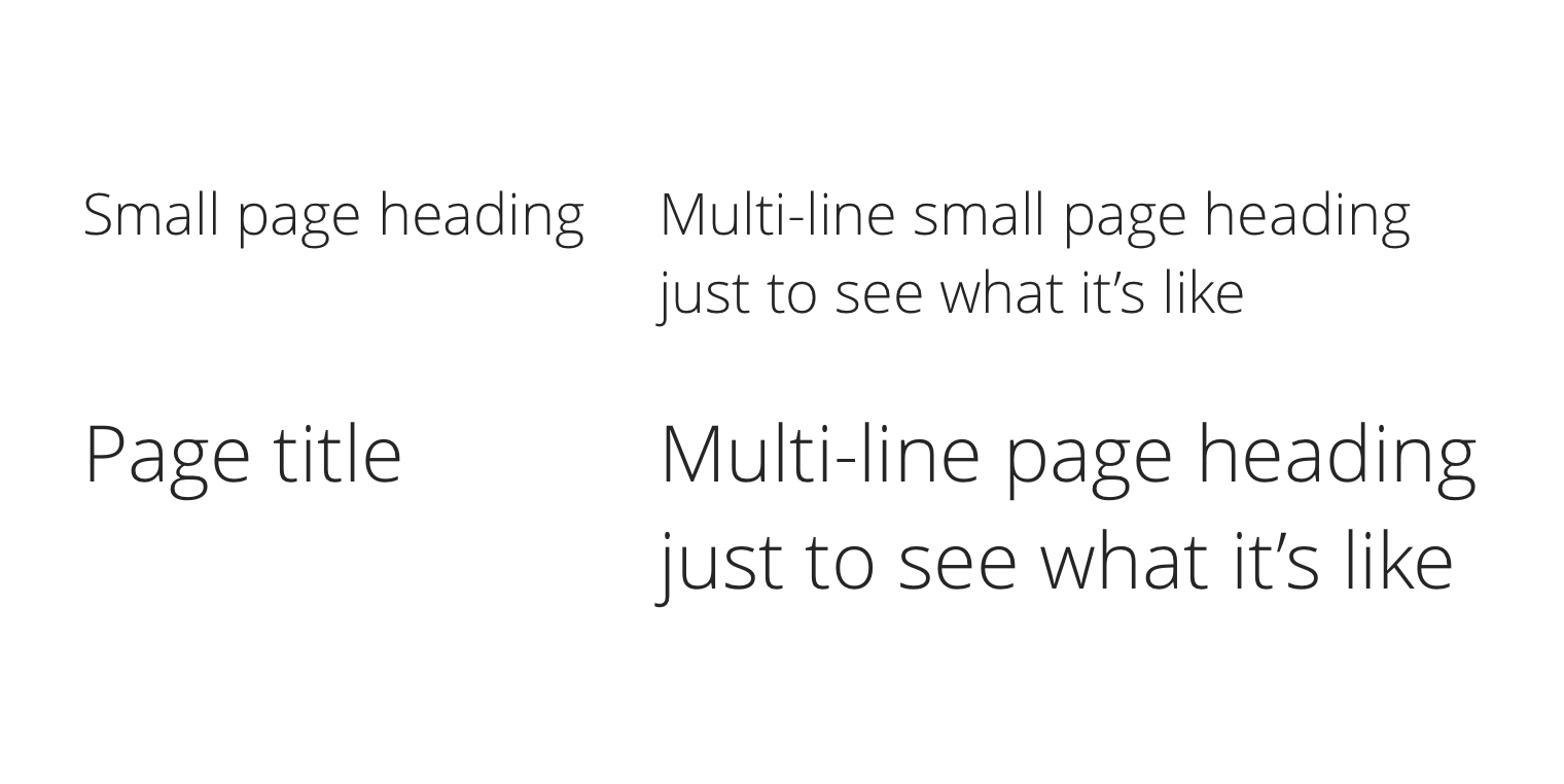 UI Headings come in two types, Page and Section. Page headings typically only appear once per page and are designed to name the current page. Section headings are designed to name the modular components that might make up a page.