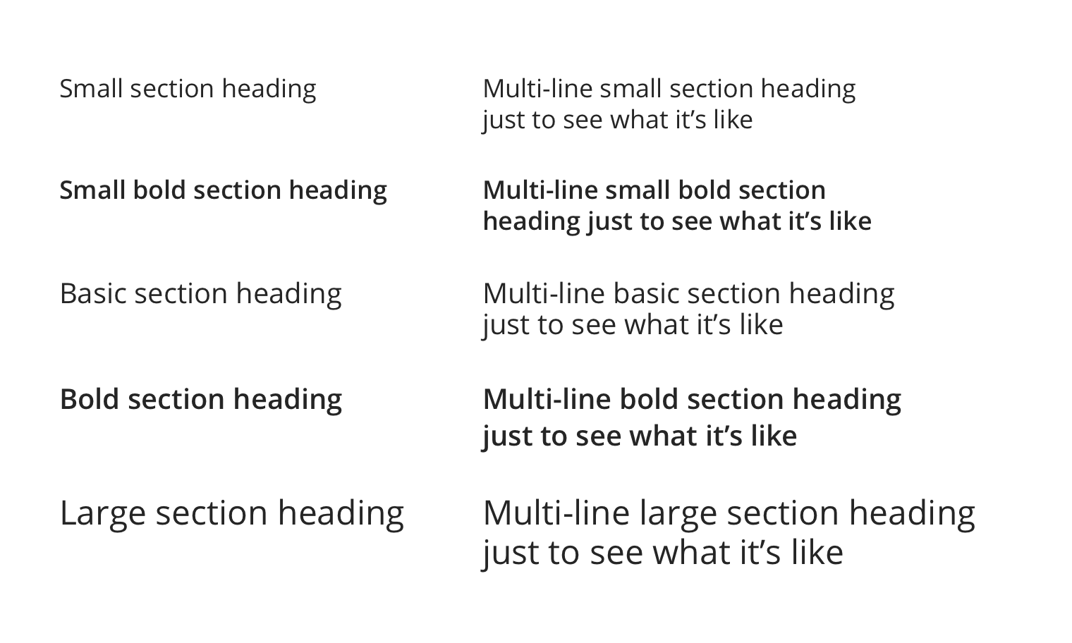 Standard Section UI Heading types in single and multiline versions.